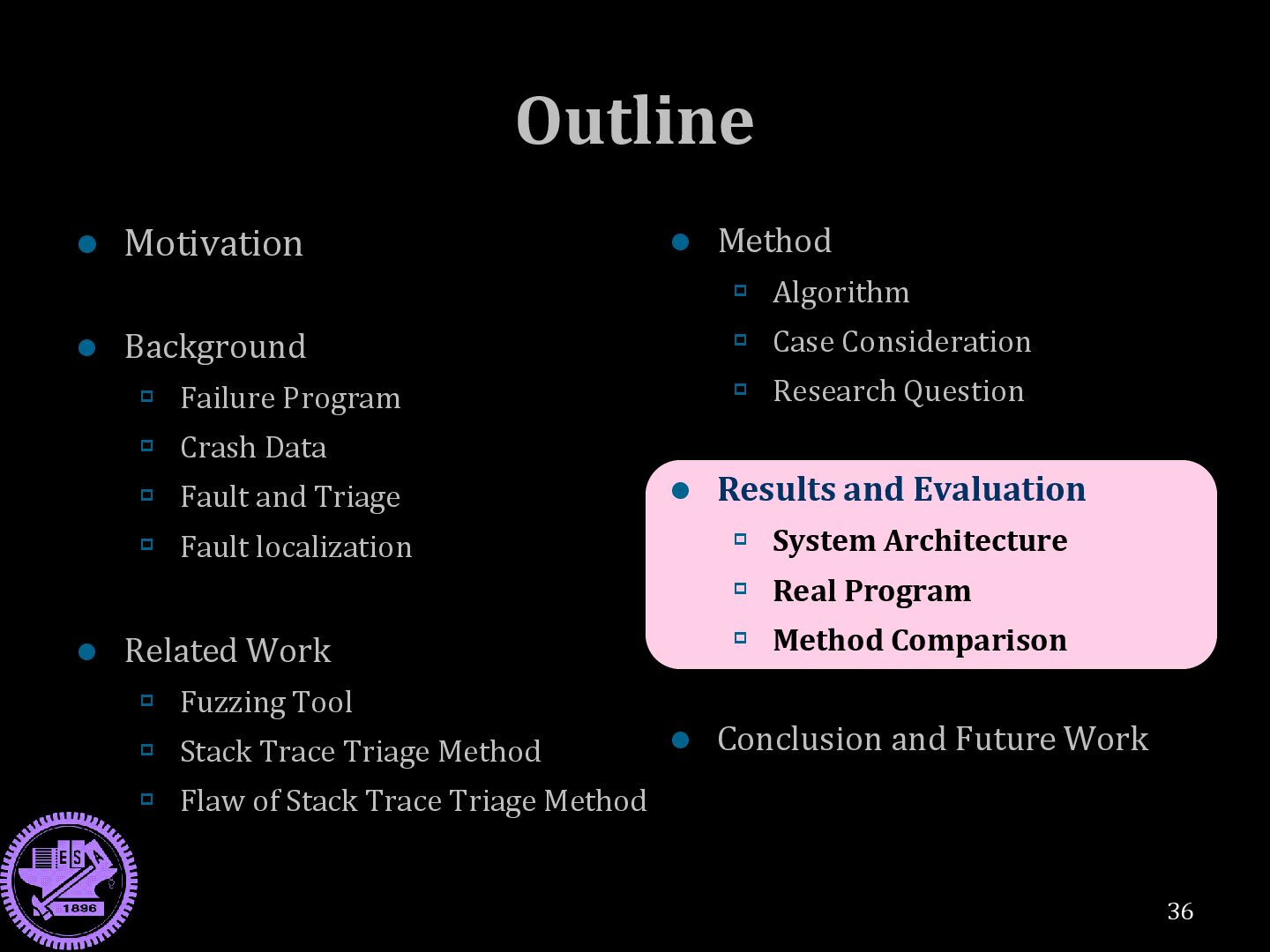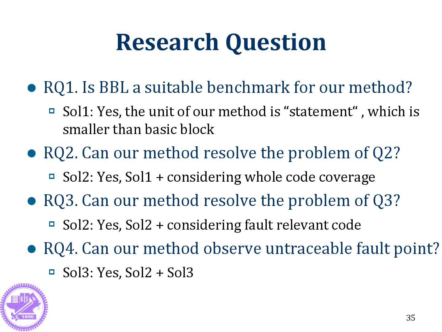 our method? Sol1: Yes, the unit of our method is “statement“ , which is smaller than basic block RQ2. Can our method resolve the problem of Q2? Sol2: Yes, Sol1 + considering whole code coverage RQ3. Can our method resolve the problem of Q3? Sol2: Yes, Sol2 + considering fault relevant code RQ4. Can our method observe untraceable fault point? Sol3: Yes, Sol2 + Sol3 35