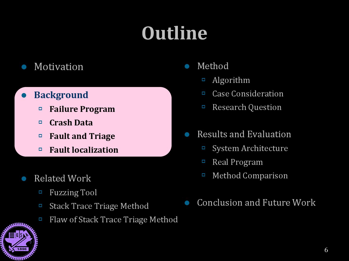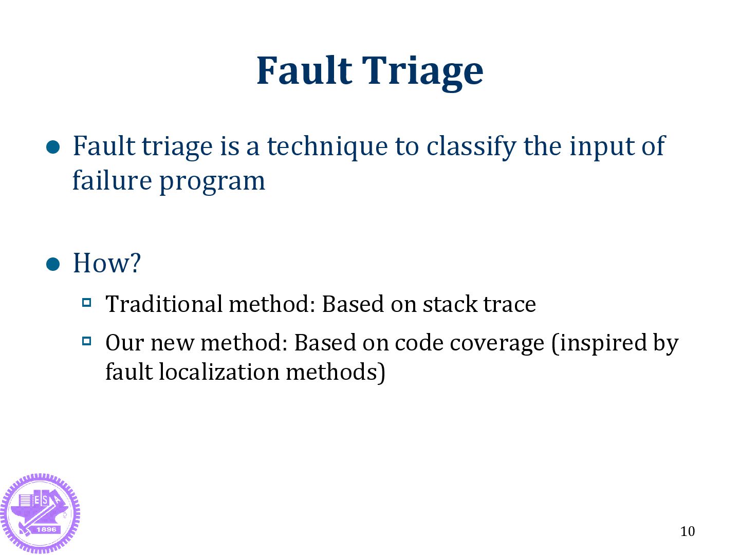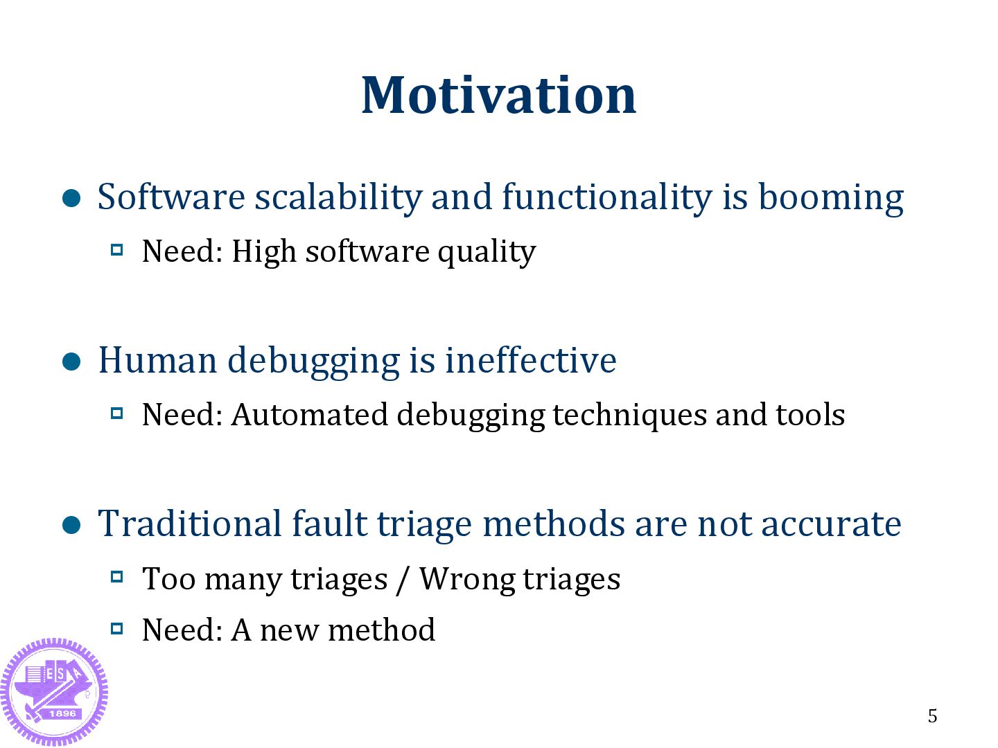 High software quality Human debugging is ineffective Need: Automated debugging techniques and tools Traditional fault triage methods are not accurate Too many triages / Wrong triages Need: A new method 5