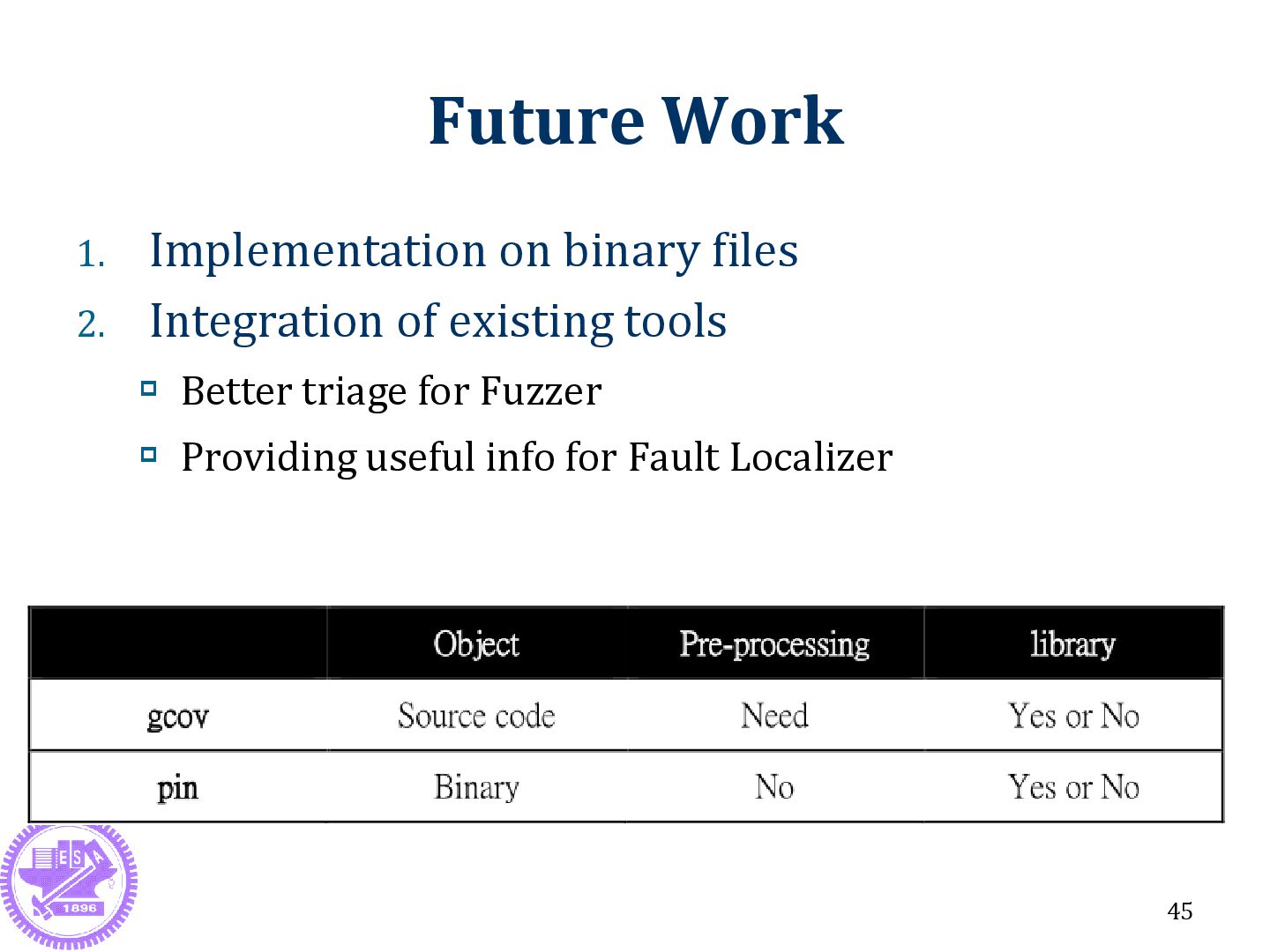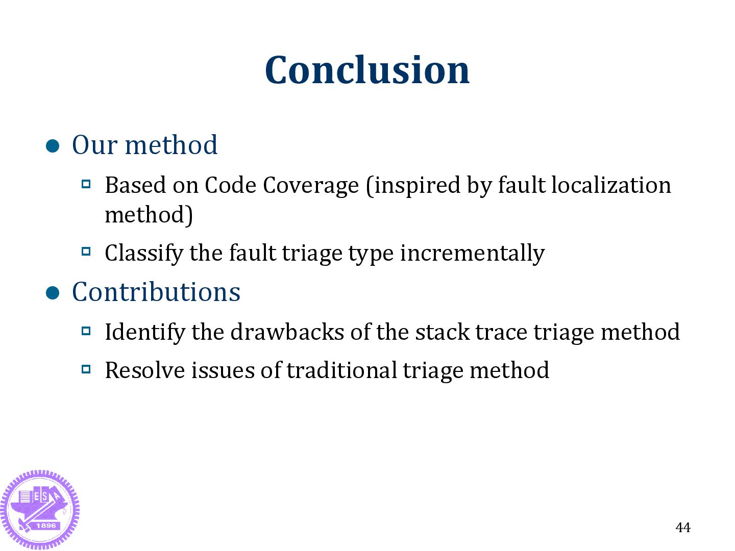 by fault localization method) Classify the fault triage type incrementally Contributions Identify the drawbacks of the stack trace triage method Resolve issues of traditional triage method 44
