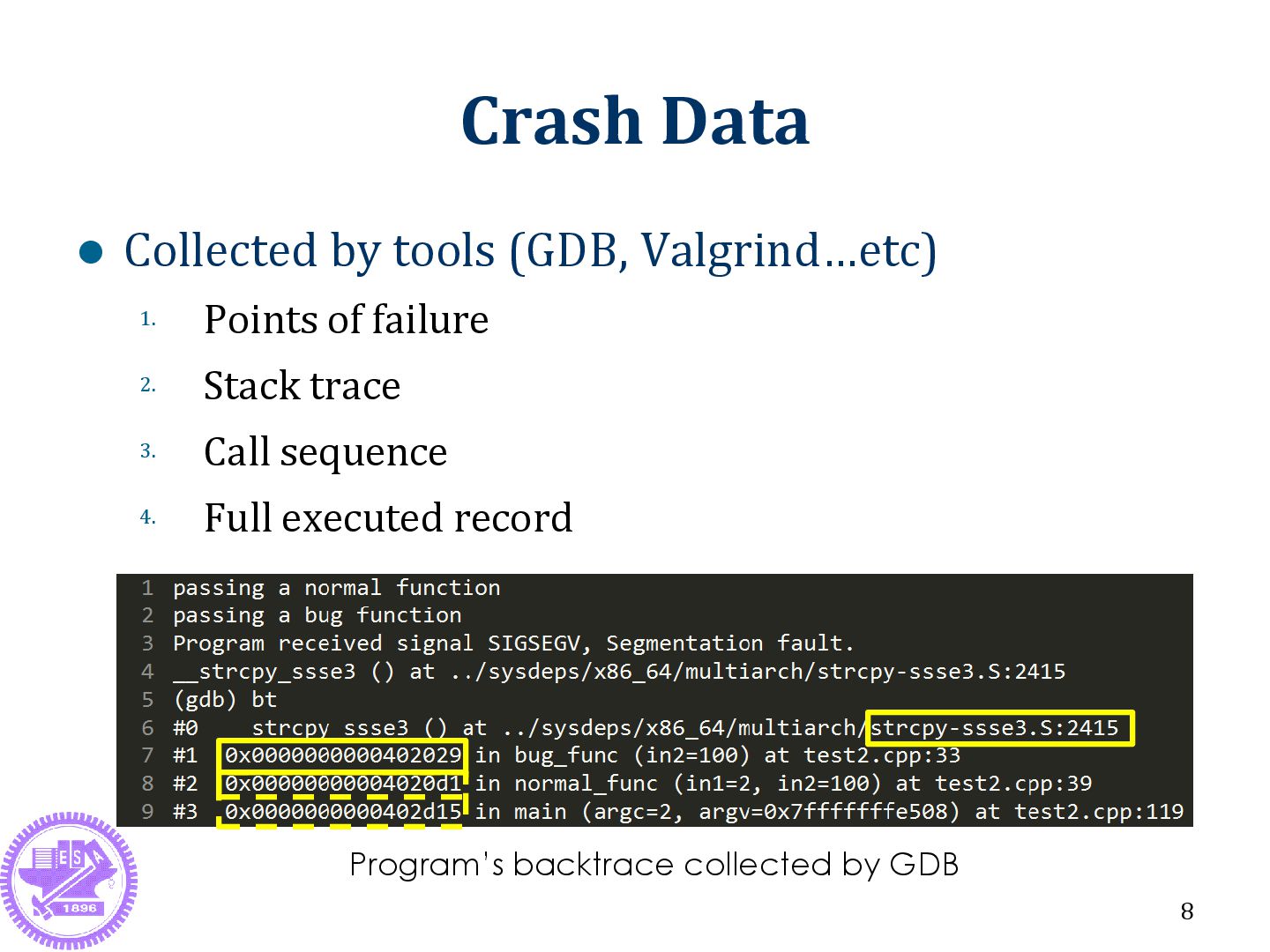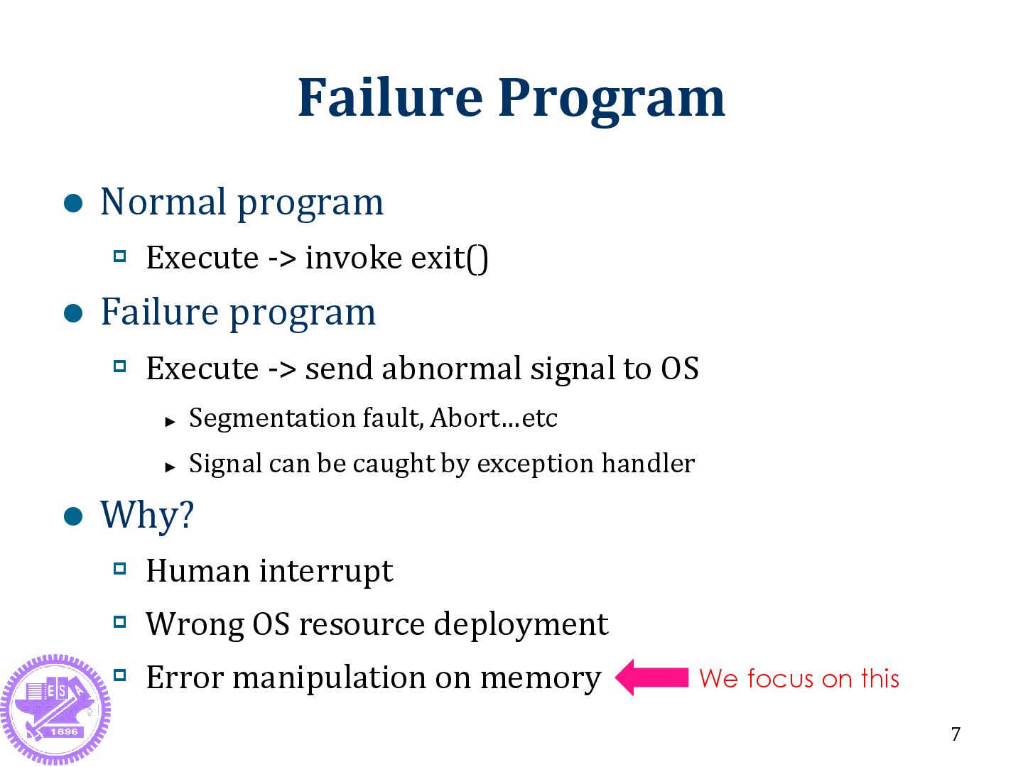Failure program Execute -> send abnormal signal to OS ► Segmentation fault, Abort…etc ► Signal can be caught by exception handler Why? Human interrupt Wrong OS resource deployment Error manipulation on memory 7 We focus on this
