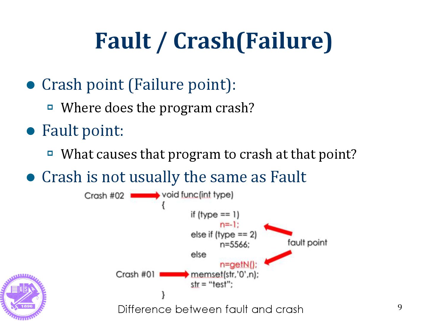 does the program crash? Fault point: What causes that program to crash at that point? Crash is not usually the same as Fault 9 Difference between fault and crash