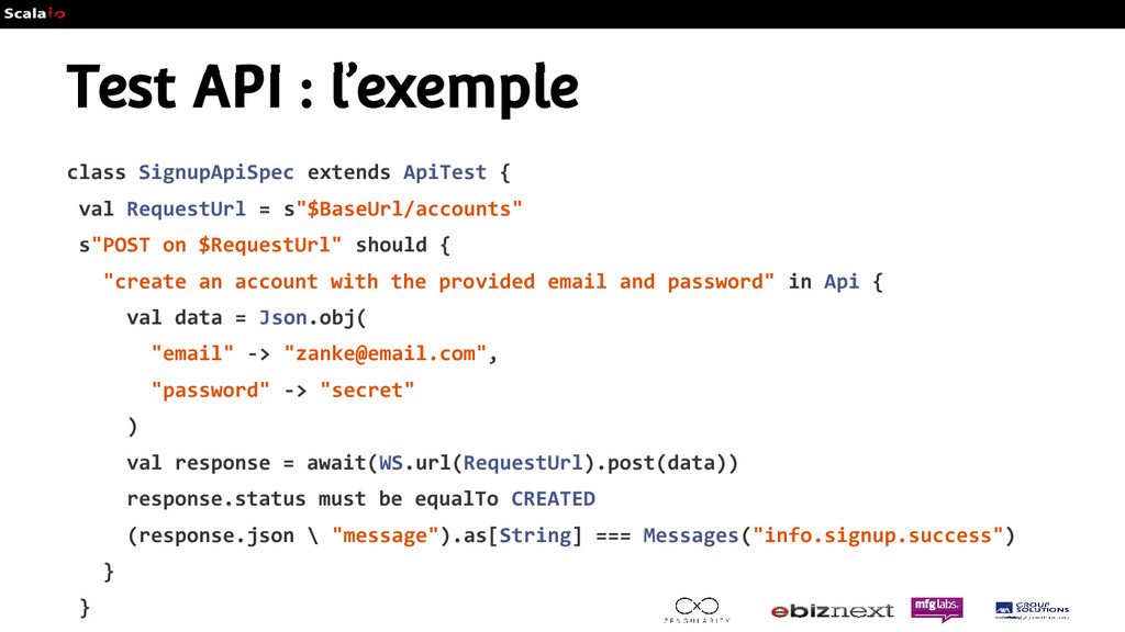 RequestUrl = s"$BaseUrl/accounts" s"POST on $RequestUrl" should { "create an account with the provided email and password" in Api { val data = Json.obj( "email" -> "[email protected]", "password" -> "secret" ) val response = await(WS.url(RequestUrl).post(data)) response.status must be equalTo CREATED (response.json \ "message").as[String] === Messages("info.signup.success") } }
