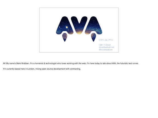 Mark Wubben. I’m a humanist & technologist who loves working with the web. I’m here today to talk about AVA, the futuristic test runner. I’m currently based here in London, mixing open source development with contracting.