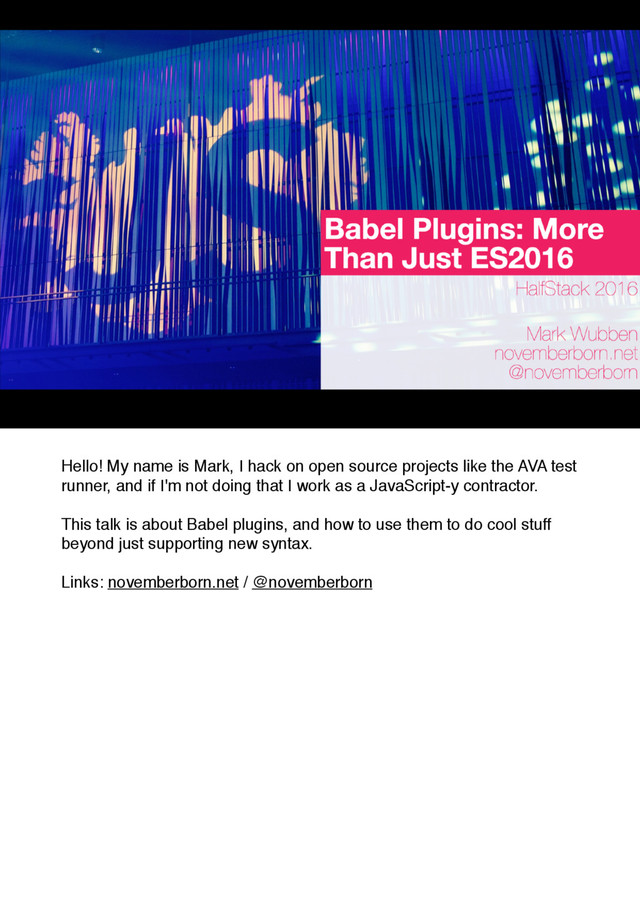 projects like the AVA test runner, and if I'm not doing that I work as a JavaScript-y contractor. This talk is about Babel plugins, and how to use them to do cool stuff beyond just supporting new syntax. Links: novemberborn.net / @novemberborn