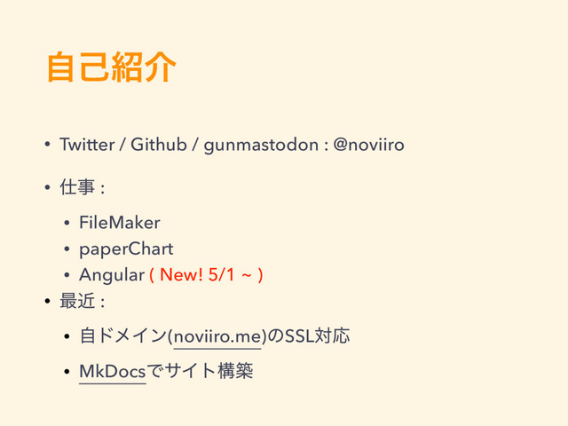 ࣄ : • FileMaker • paperChart • Angular ( New! 5/1 ~ ) • ࠷ۙ : • ࣗυϝΠϯ(noviiro.me)ͷSSLରԠ • MkDocsͰαΠτߏங