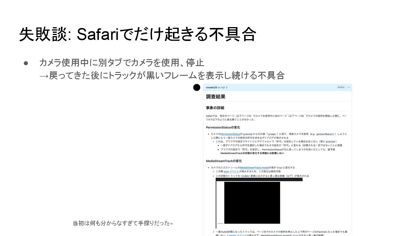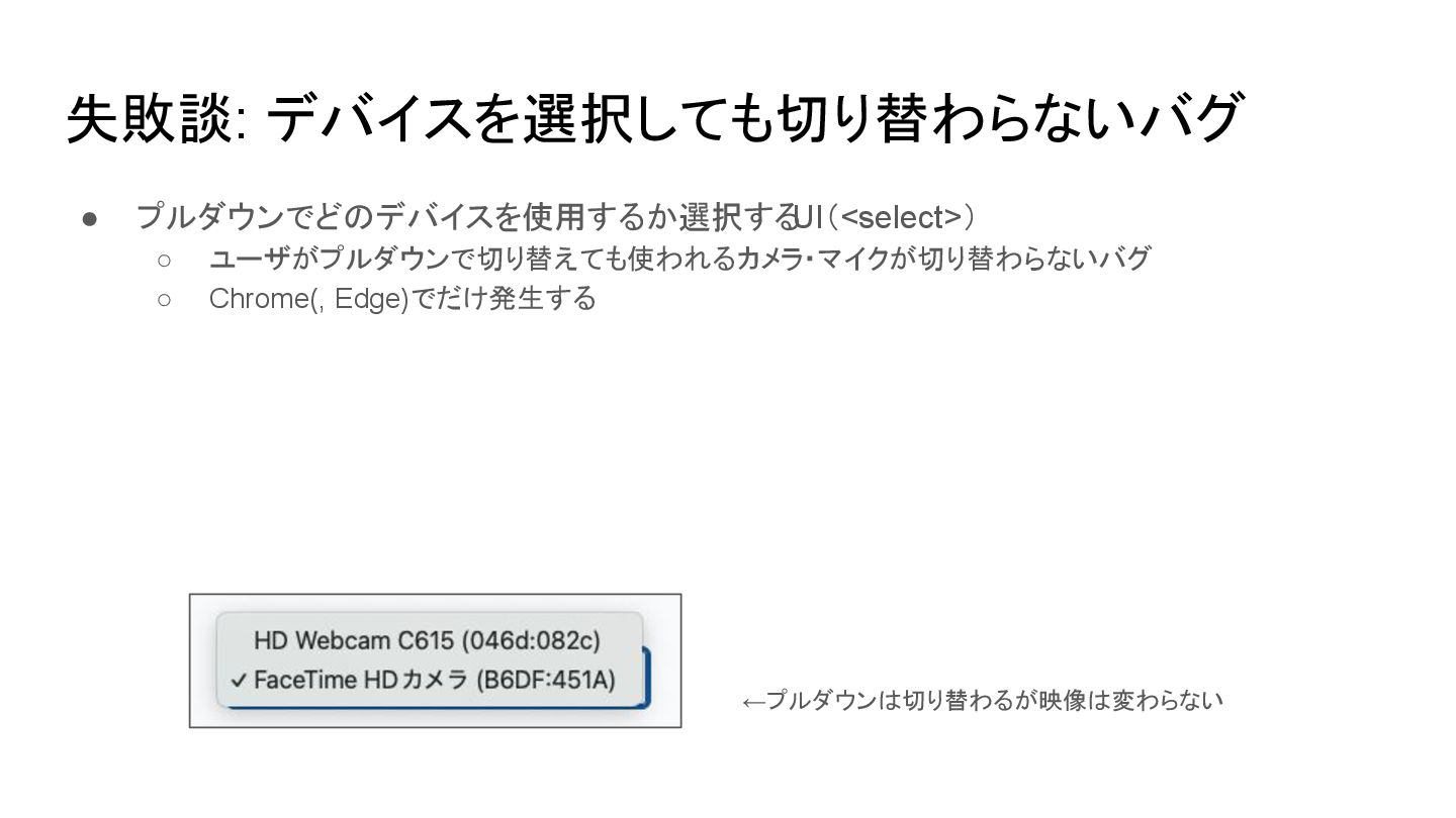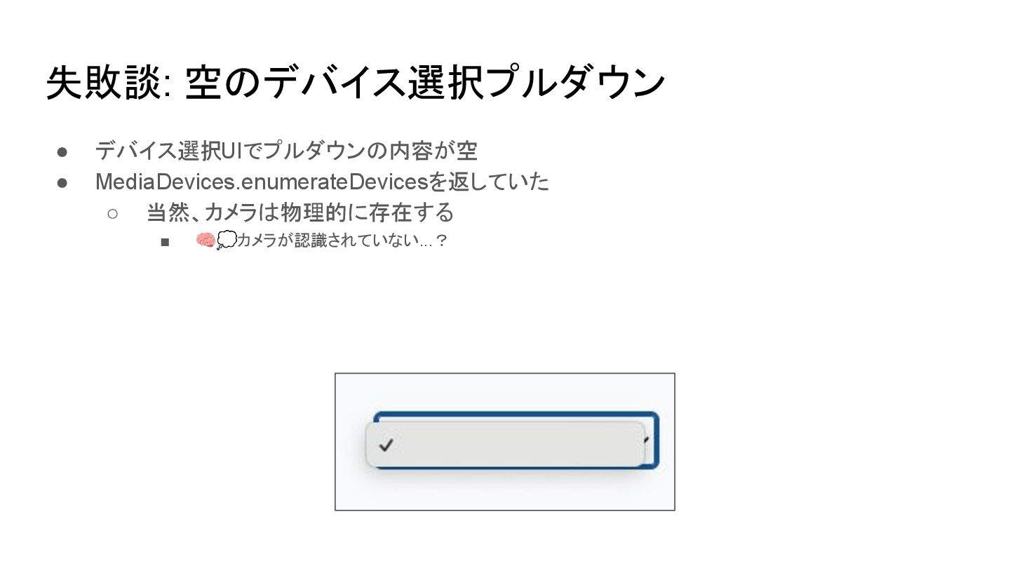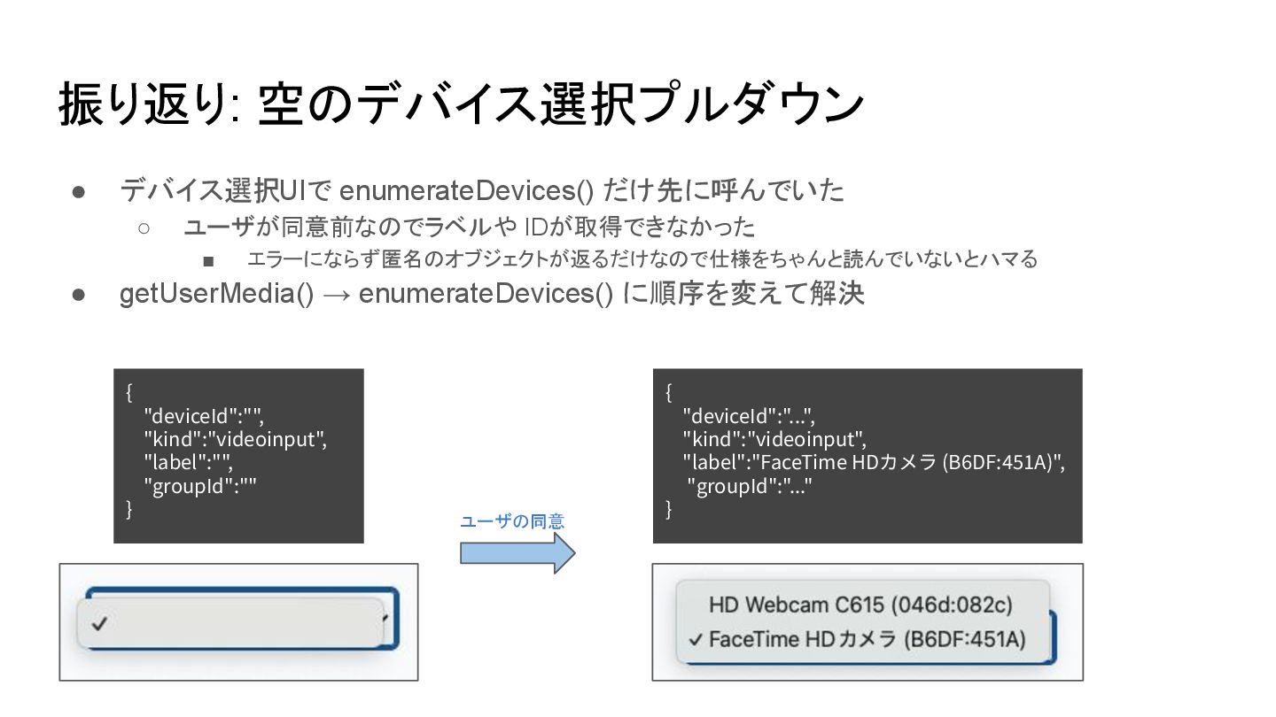 エラーにならず匿名のオブジェクトが返るだけなので仕様をちゃんと読んでいないとハマる • getUserMedia() → enumerateDevices() に順序を変えて解決 { "deviceId":"", "kind":"videoinput", "label":"", "groupId":"" } { "deviceId":"...", "kind":"videoinput", "label":"FaceTime HDカメラ (B6DF:451A)", "groupId":"..." } ユーザの同意