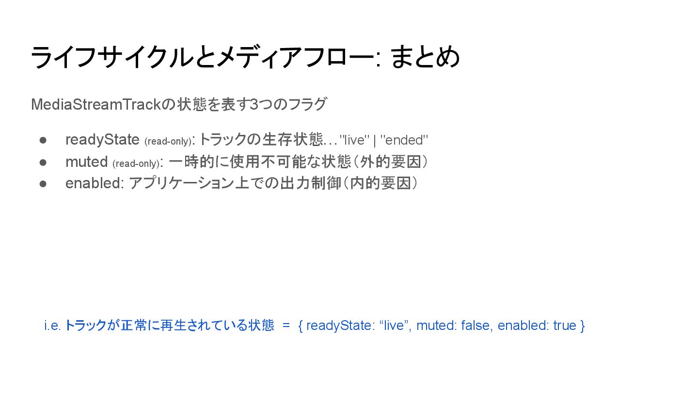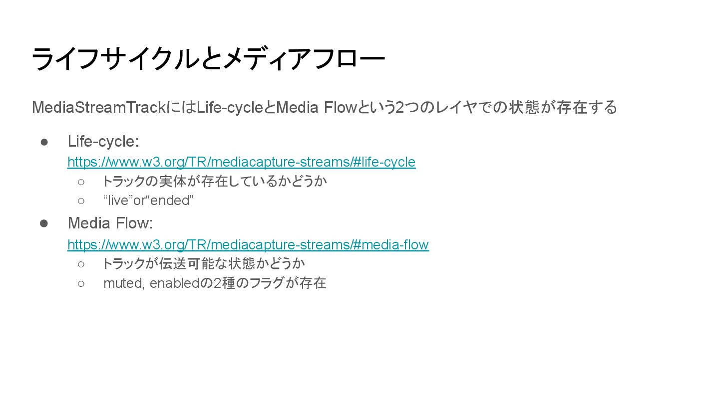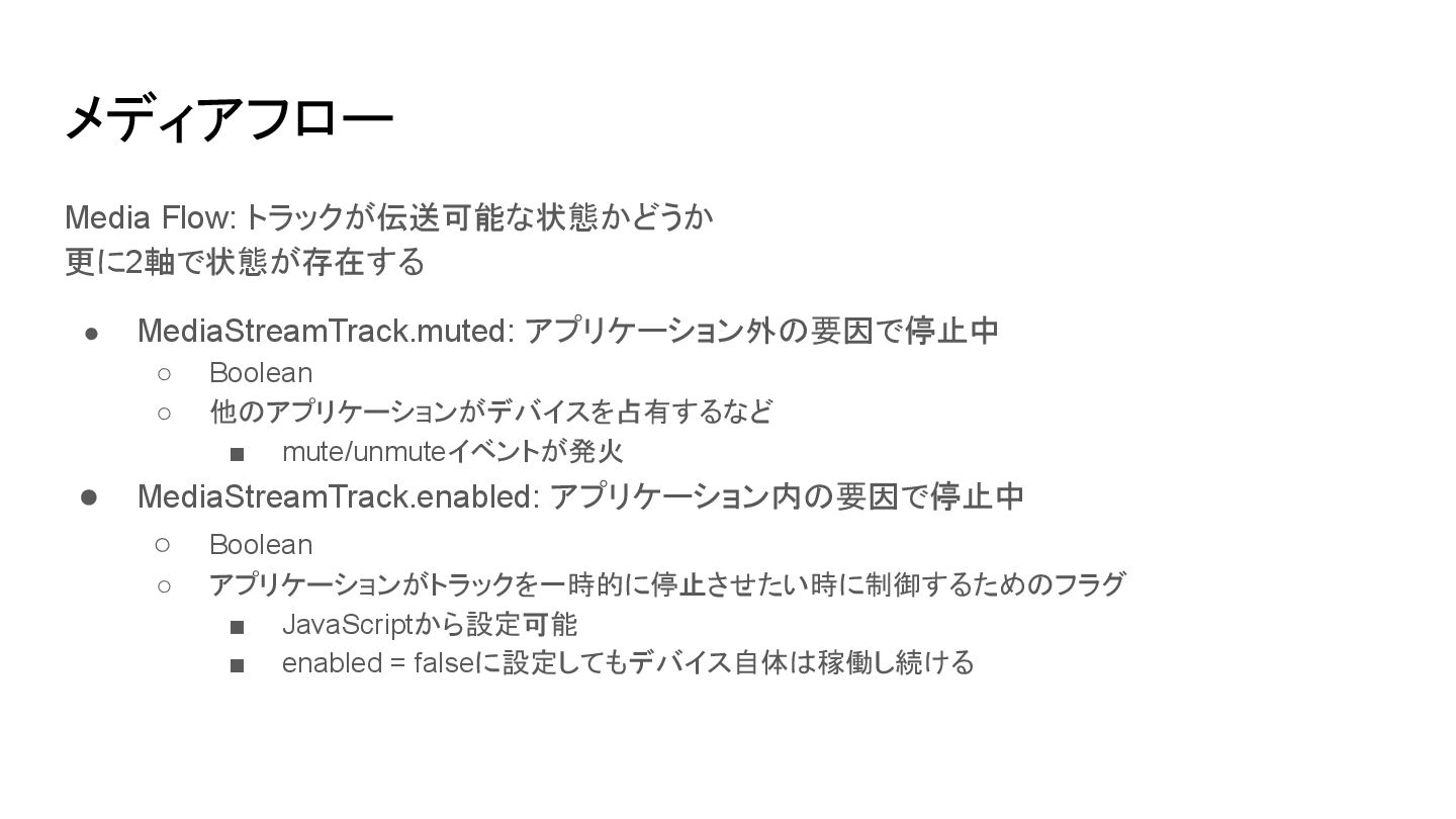 ◦ 他のアプリケーションがデバイスを占有するなど ▪ mute/unmuteイベントが発火 • MediaStreamTrack.enabled: アプリケーション内の要因で停止中 ◦ Boolean ◦ アプリケーションがトラックを一時的に停止させたい時に制御するためのフラグ ▪ JavaScriptから設定可能 ▪ enabled = falseに設定してもデバイス自体は稼働し続ける
