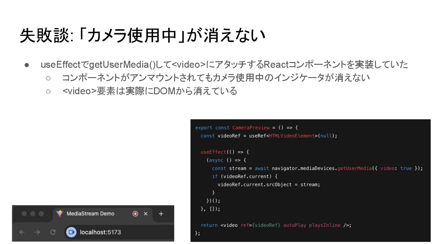 8. 振り返り: 「カメラ使用中」が消えない • コンポーネント内で完結しているため、あまり考えずに (GCされるので)放っておいてもいいと 思っていた ◦ → 一度カメラを使うとインジケータが消えないバグ ◦