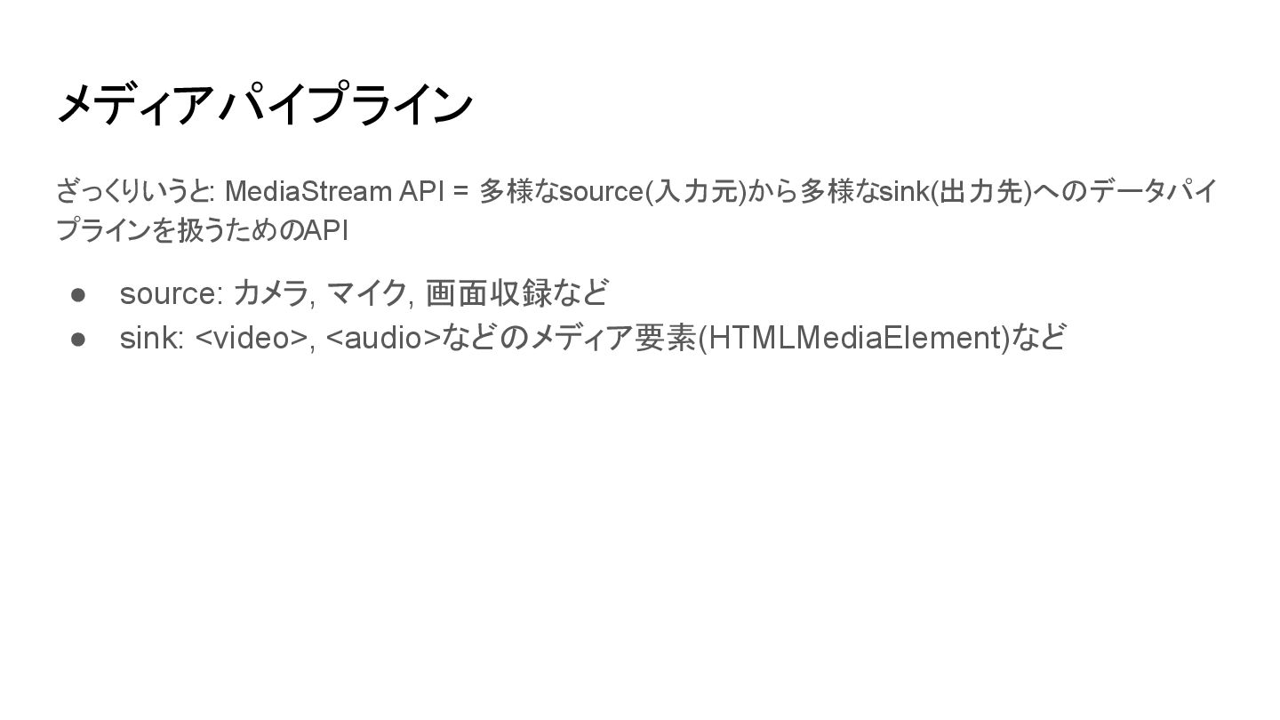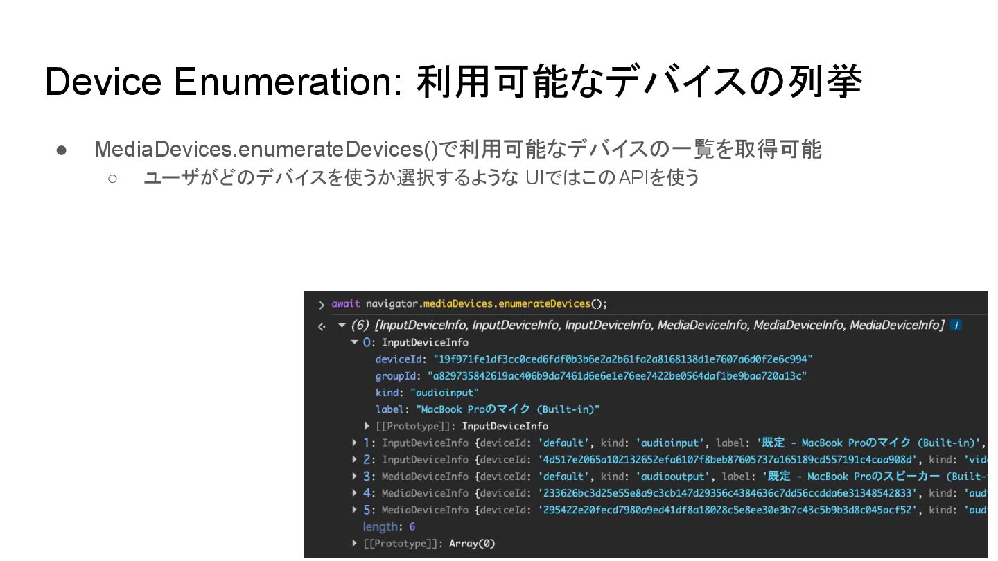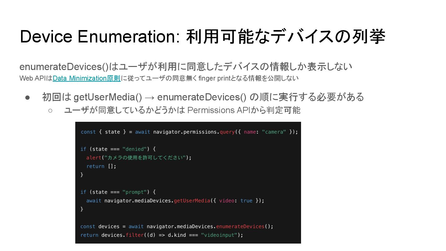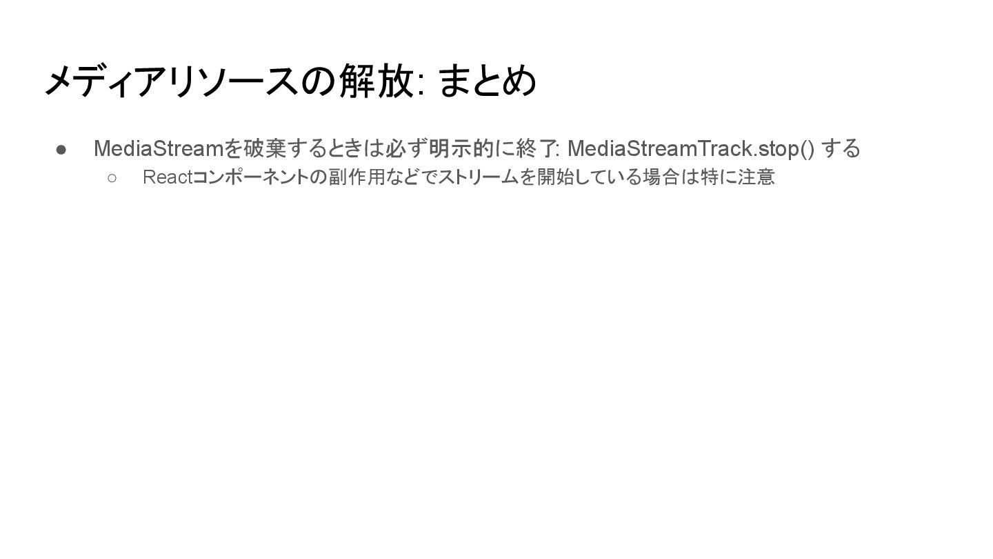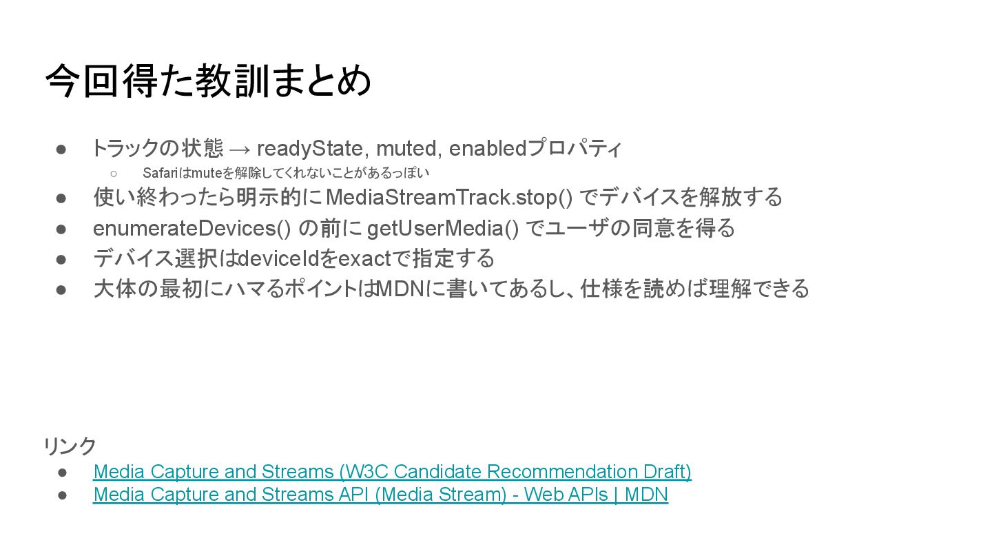 使い終わったら明示的に MediaStreamTrack.stop() でデバイスを解放する • enumerateDevices() の前に getUserMedia() でユーザの同意を得る • デバイス選択はdeviceIdをexactで指定する • 大体の最初にハマるポイントは MDNに書いてあるし、仕様を読めば理解できる リンク • Media Capture and Streams (W3C Candidate Recommendation Draft) • Media Capture and Streams API (Media Stream) - Web APIs | MDN