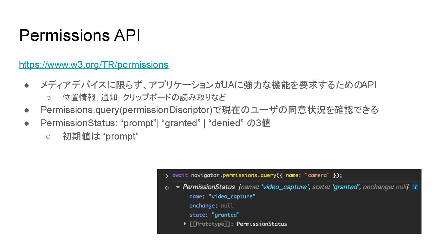 9. Permissions API https://www.w3.org/TR/permissions • メディアデバイスに限らず、アプリケーションが UAに強力な機能を要求するための API ◦ 位置情報, 通知,