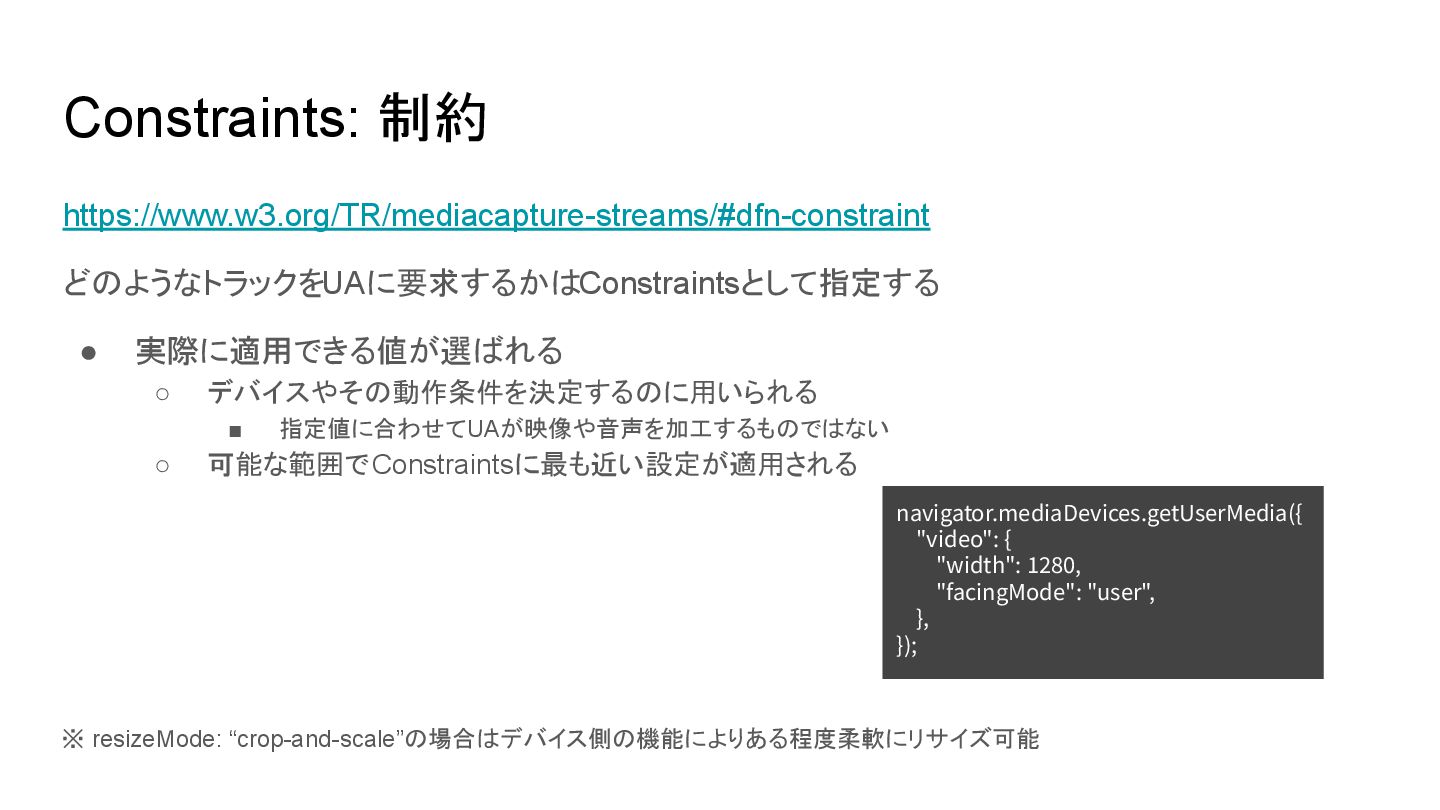 ◦ 可能な範囲でConstraintsに最も近い設定が適用される ※ resizeMode: “crop-and-scale”の場合はデバイス側の機能によりある程度柔軟にリサイズ可能 navigator.mediaDevices.getUserMedia({ "video": { "width": 1280, "facingMode": "user", }, });