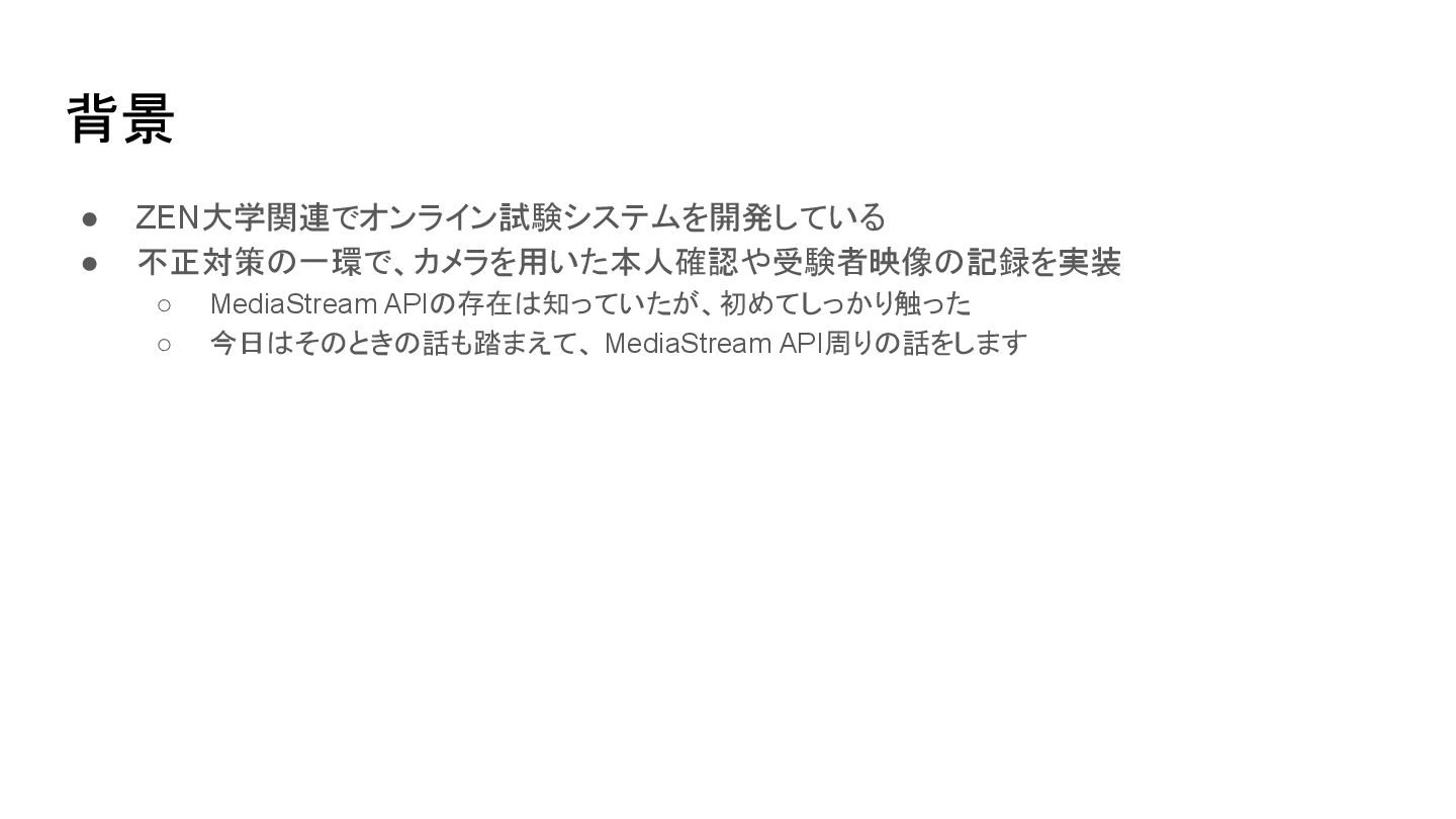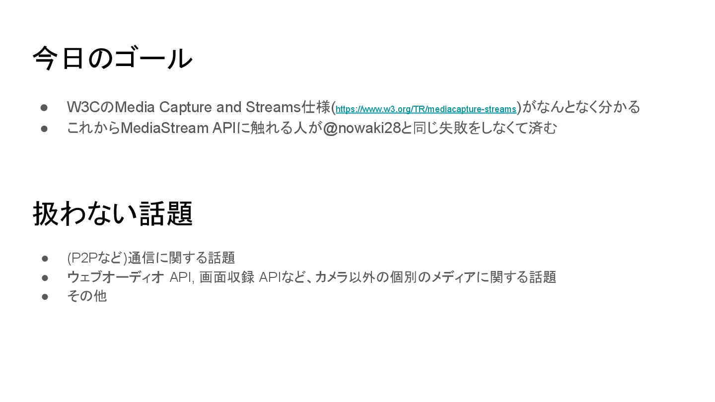 1. 今日のゴール • W3CのMedia Capture and Streams仕様(https://www.w3.org/TR/mediacapture-streams)がなんとなく分かる • これからMediaStream APIに触れる人が@nowaki28と同じ失敗をしなくて済む 扱わない話題