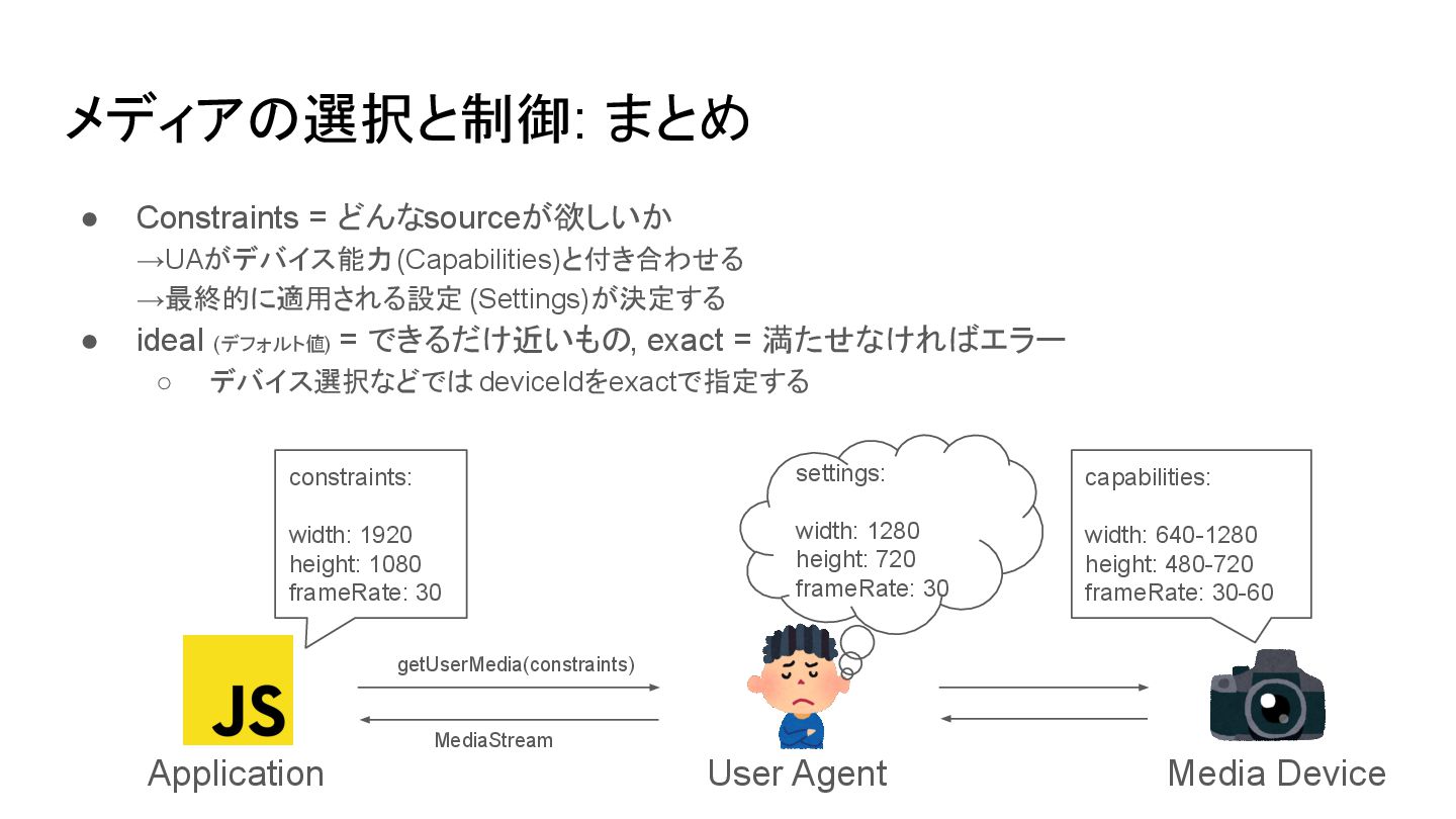ideal (デフォルト値) = できるだけ近いもの, exact = 満たせなければエラー ◦ デバイス選択などでは deviceIdをexactで指定する User Agent Application Media Device constraints: width: 1920 height: 1080 frameRate: 30 capabilities: width: 640-1280 height: 480-720 frameRate: 30-60 settings: width: 1280 height: 720 frameRate: 30 getUserMedia(constraints) MediaStream