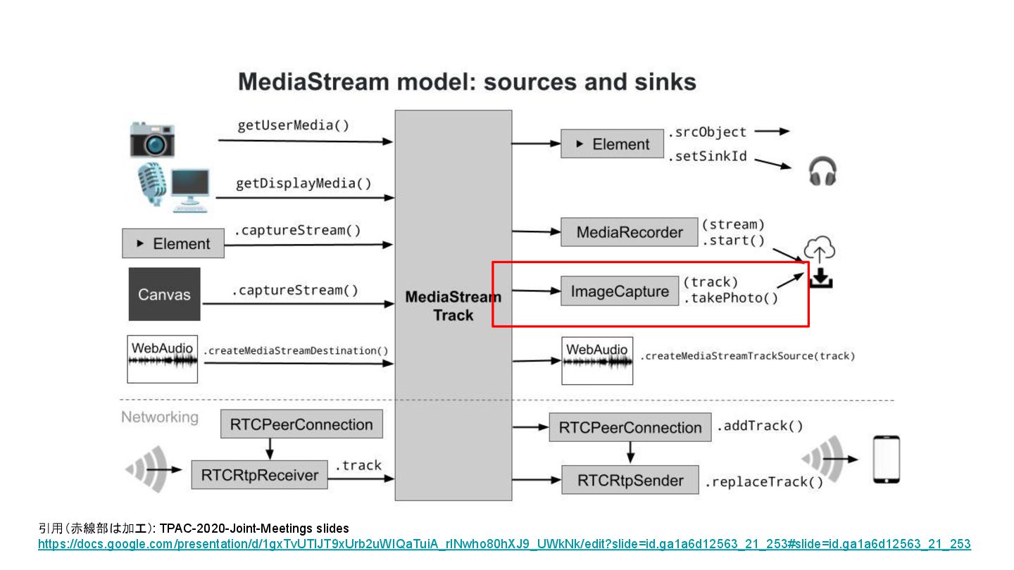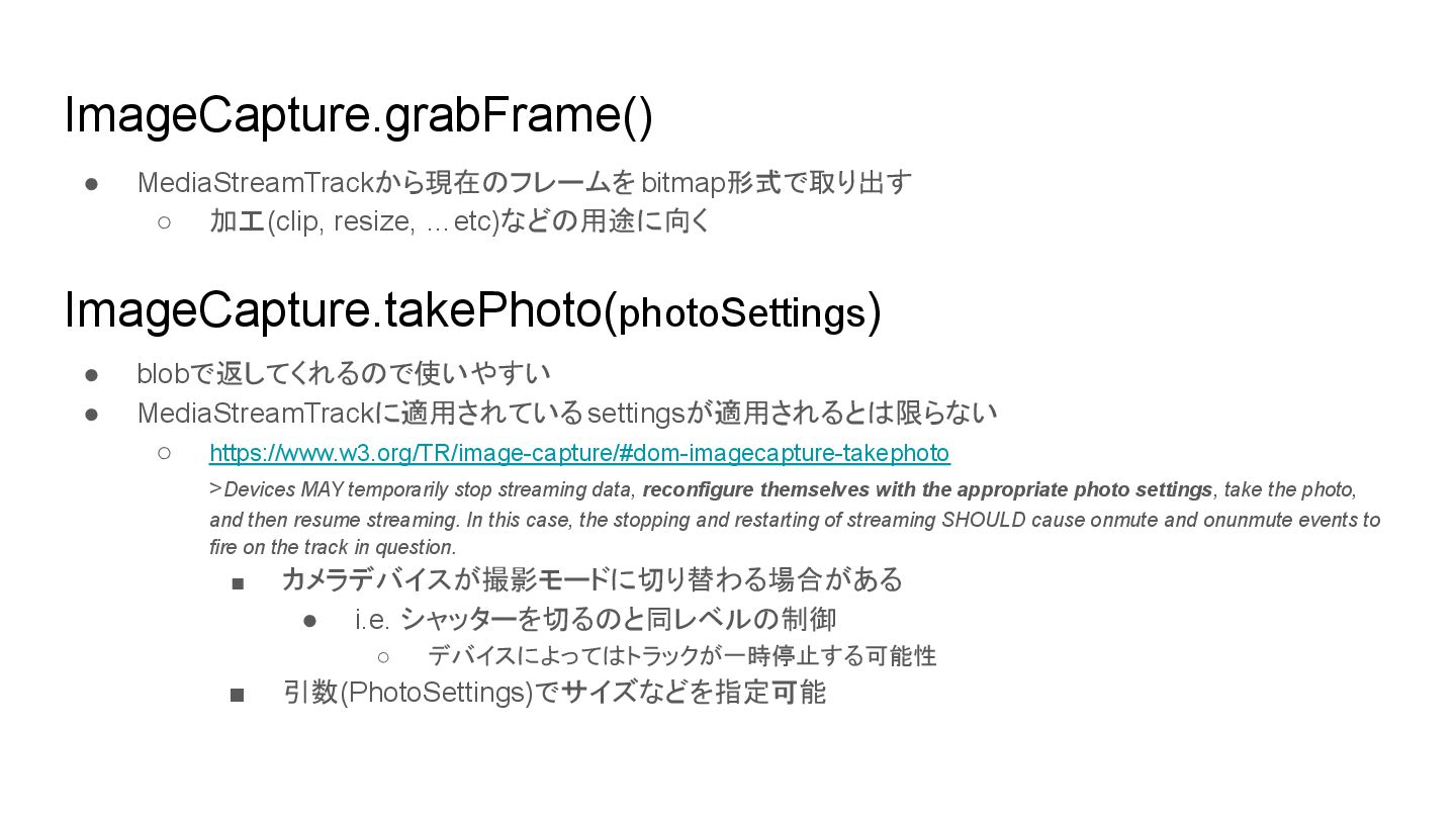 blobで返してくれるので使いやすい • MediaStreamTrackに適用されているsettingsが適用されるとは限らない ◦ https://www.w3.org/TR/image-capture/#dom-imagecapture-takephoto >Devices MAY temporarily stop streaming data, reconfigure themselves with the appropriate photo settings, take the photo, and then resume streaming. In this case, the stopping and restarting of streaming SHOULD cause onmute and onunmute events to fire on the track in question. ▪ カメラデバイスが撮影モードに切り替わる場合がある • i.e. シャッターを切るのと同レベルの制御 ◦ デバイスによってはトラックが一時停止する可能性 ▪ 引数(PhotoSettings)でサイズなどを指定可能