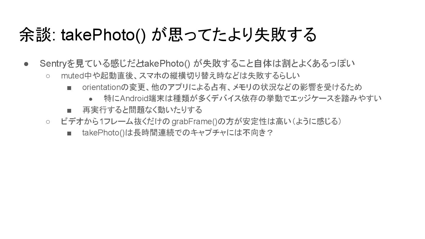 • 特にAndroid端末は種類が多くデバイス依存の挙動でエッジケースを踏みやすい ▪ 再実行すると問題なく動いたりする ◦ ビデオから1フレーム抜くだけのgrabFrame()の方が安定性は高い(ように感じる) ▪ takePhoto()は長時間連続でのキャプチャには不向き?