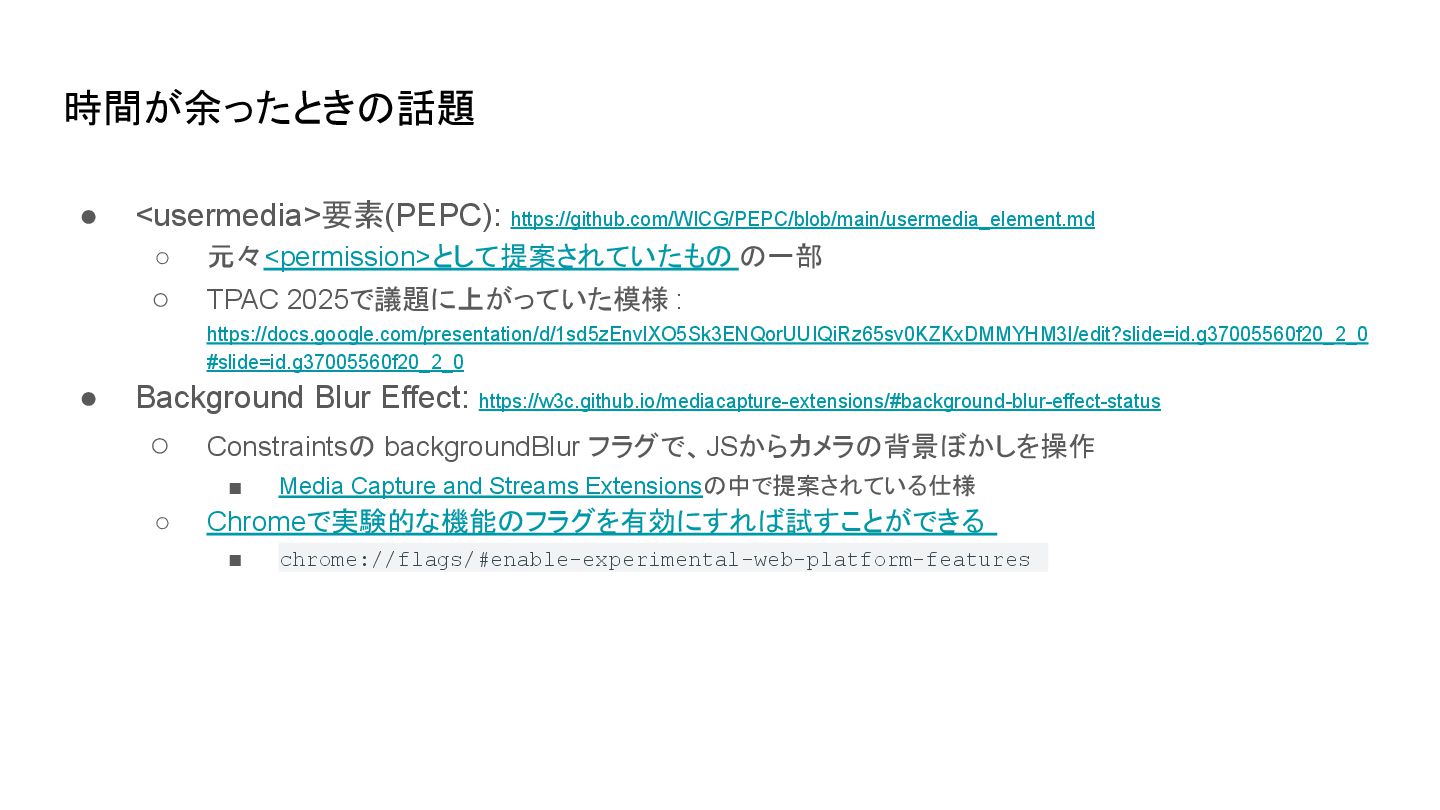 : https://docs.google.com/presentation/d/1sd5zEnvlXO5Sk3ENQorUUIQiRz65sv0KZKxDMMYHM3I/edit?slide=id.g37005560f20_2_0 #slide=id.g37005560f20_2_0 • Background Blur Effect: https://w3c.github.io/mediacapture-extensions/#background-blur-effect-status ◦ Constraintsの backgroundBlur フラグで、JSからカメラの背景ぼかしを操作 ▪ Media Capture and Streams Extensionsの中で提案されている仕様 ◦ Chromeで実験的な機能のフラグを有効にすれば試すことができる ▪ chrome://flags/#enable-experimental-web-platform-features