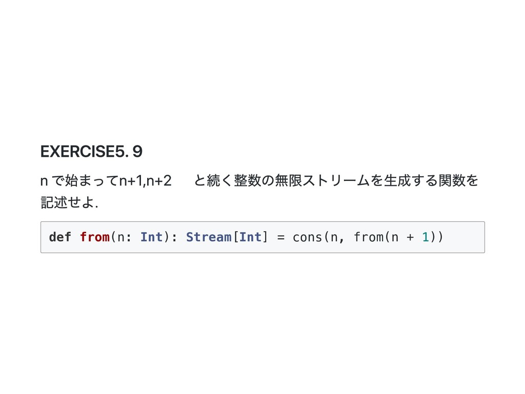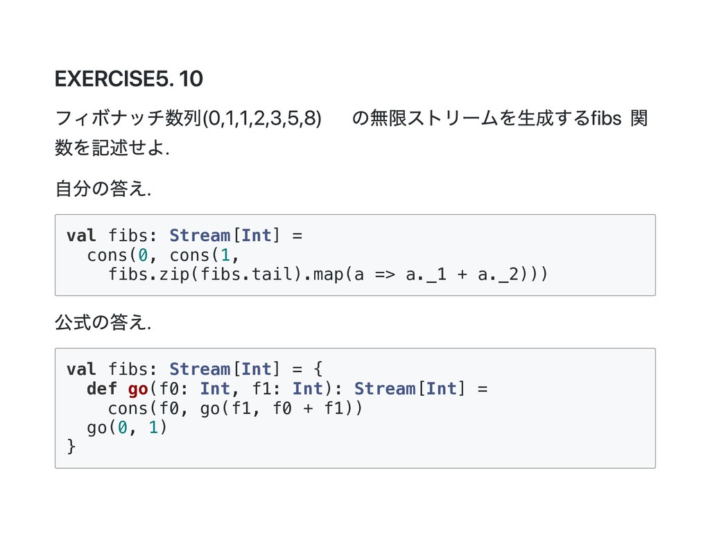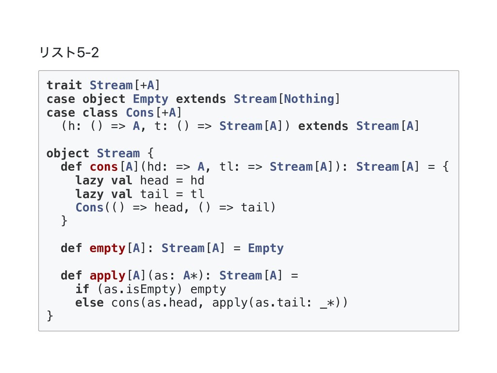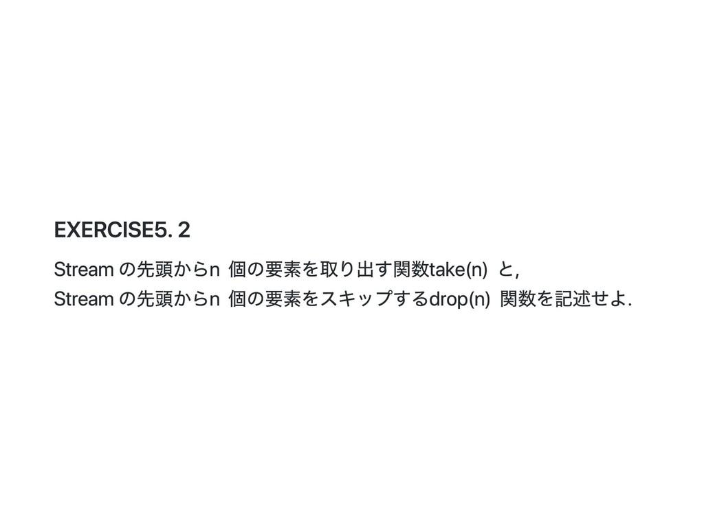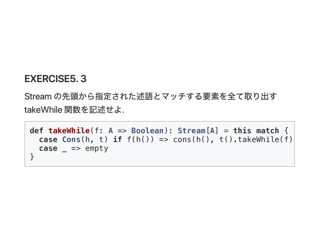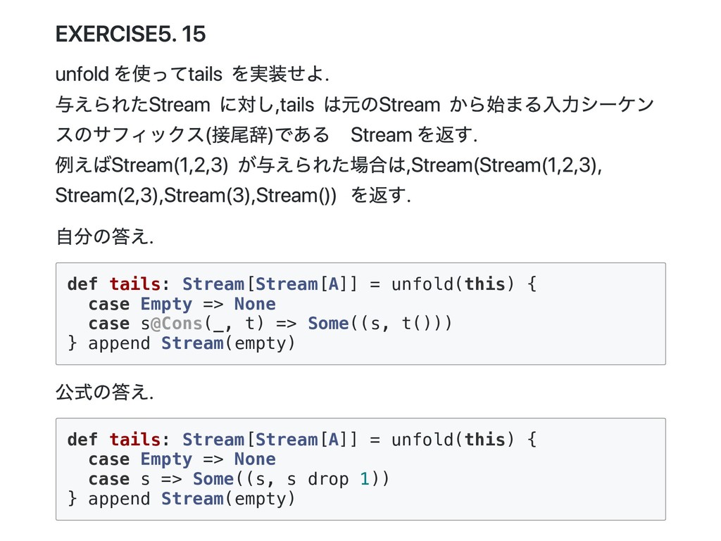 Cons(h, t) if 0 < n => cons(h(), t().take(n - 1)) case _ => empty } 公式の答え. n == 1 のときは empty を詰めるようにすると t() を評価しないで済むた め?? def take(n: Int): Stream[A] = this match { case Cons(h, t) if n > 1 => cons(h(), t().take(n - 1)) case Cons(h, _) if n == 1 => cons(h(), empty) case _ => empty } @annotation.tailrec final def drop(n: Int): Stream[A] = this match { case Cons(_, t) if n > 0 => t().drop(n - 1) case _ => this }
