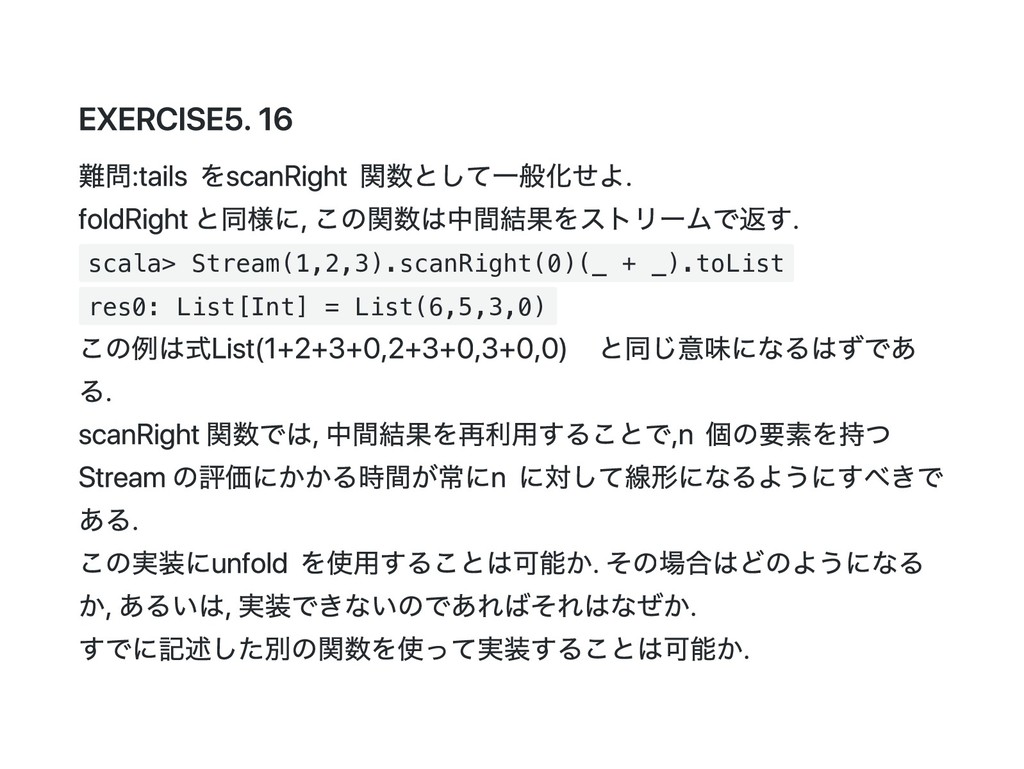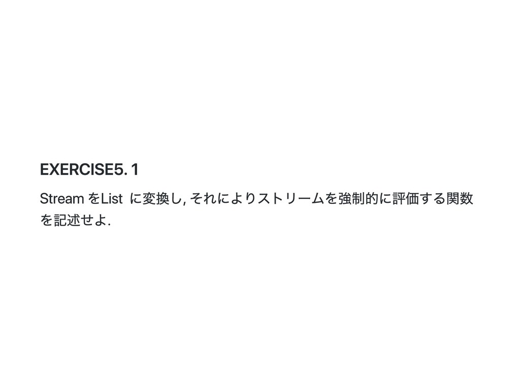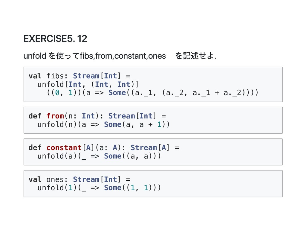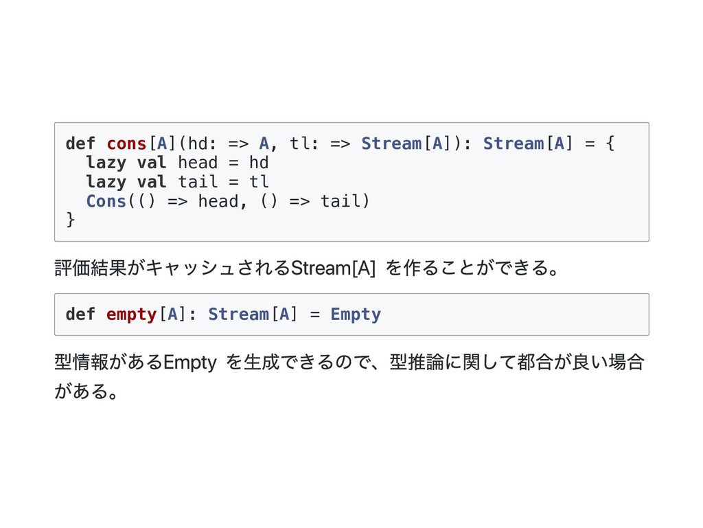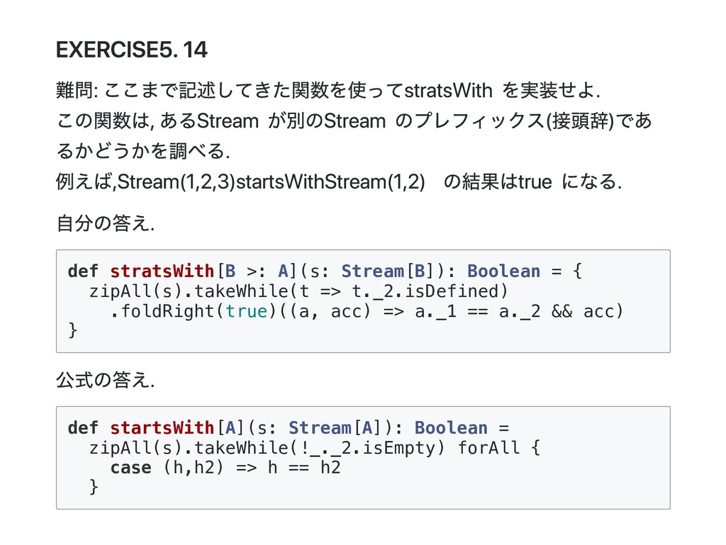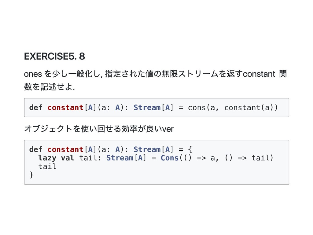 Cons(h, t) if 0 < n => cons(h(), t().take(n - 1)) case _ => empty } 公式の答え. n == 1 のときは empty を詰めるようにすると t() を評価しないで済むた め?? def take(n: Int): Stream[A] = this match { case Cons(h, t) if n > 1 => cons(h(), t().take(n - 1)) case Cons(h, _) if n == 1 => cons(h(), empty) case _ => empty } @annotation.tailrec final def drop(n: Int): Stream[A] = this match { case Cons(_, t) if n > 0 => t().drop(n - 1) case _ => this }