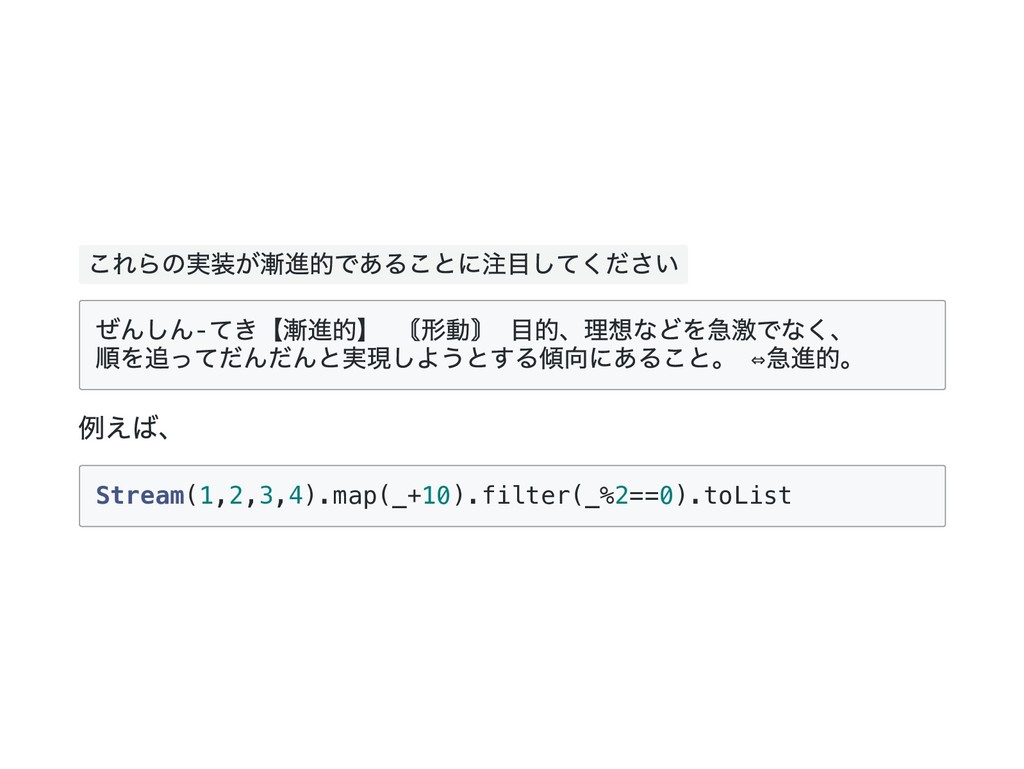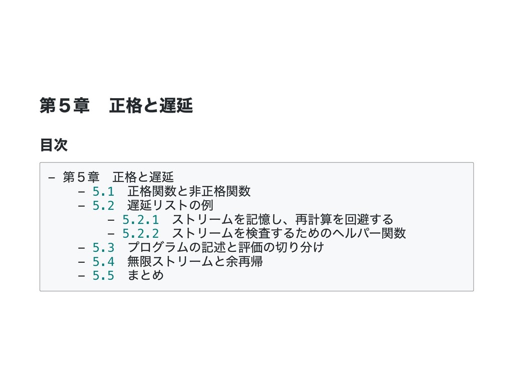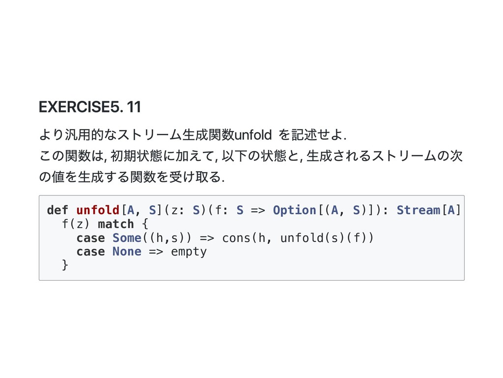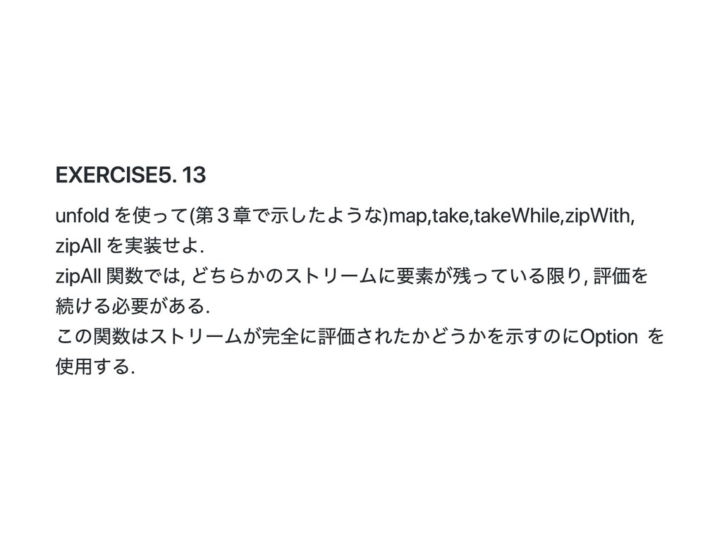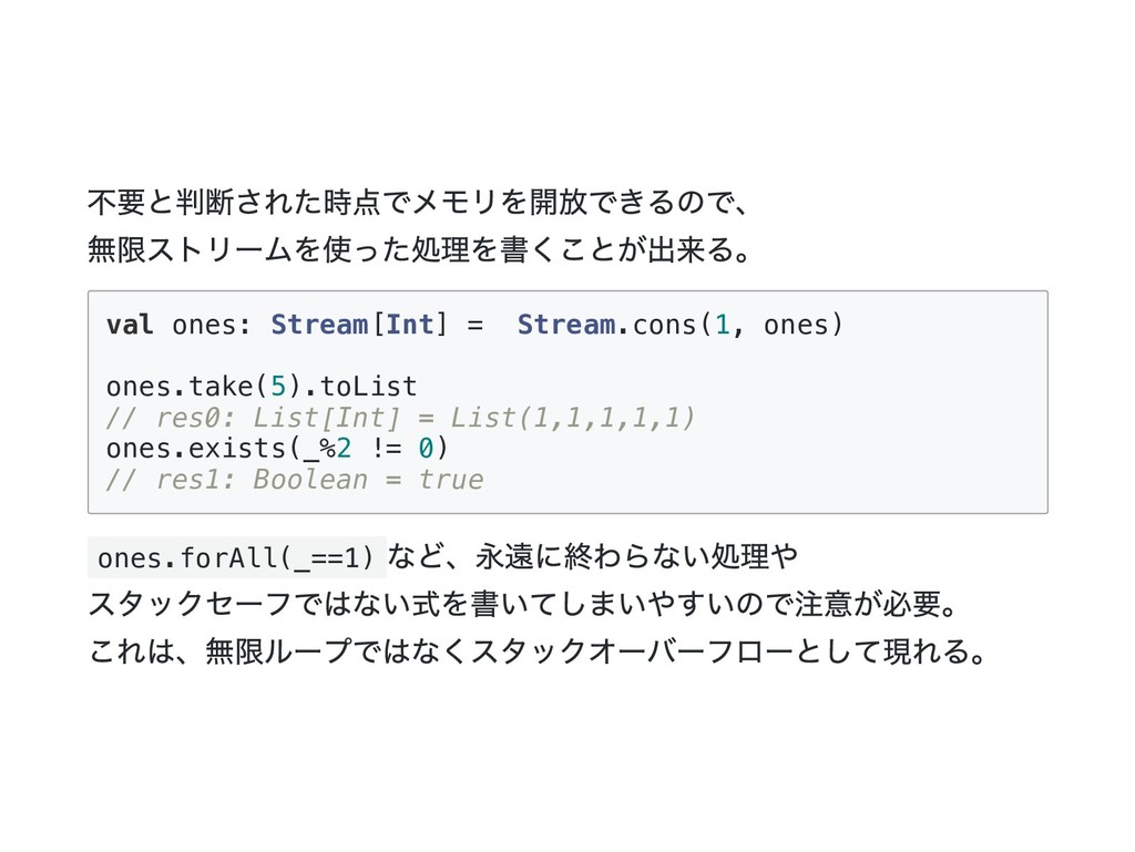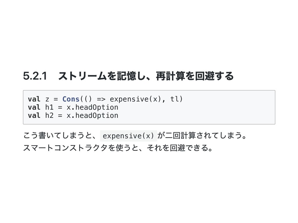 Cons(h, t) if 0 < n => cons(h(), t().take(n - 1)) case _ => empty } 公式の答え. n == 1 のときは empty を詰めるようにすると t() を評価しないで済むた め?? def take(n: Int): Stream[A] = this match { case Cons(h, t) if n > 1 => cons(h(), t().take(n - 1)) case Cons(h, _) if n == 1 => cons(h(), empty) case _ => empty } @annotation.tailrec final def drop(n: Int): Stream[A] = this match { case Cons(_, t) if n > 0 => t().drop(n - 1) case _ => this }