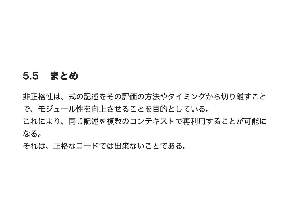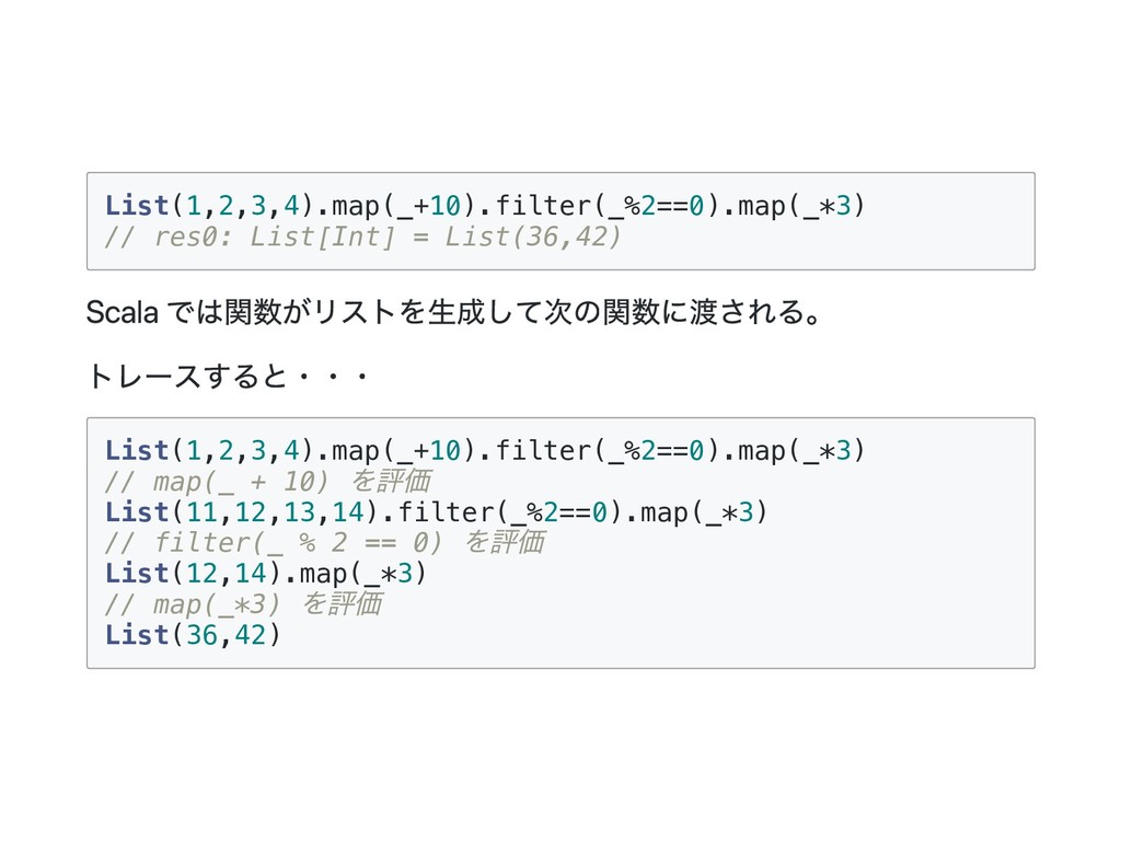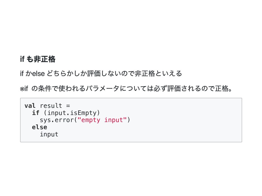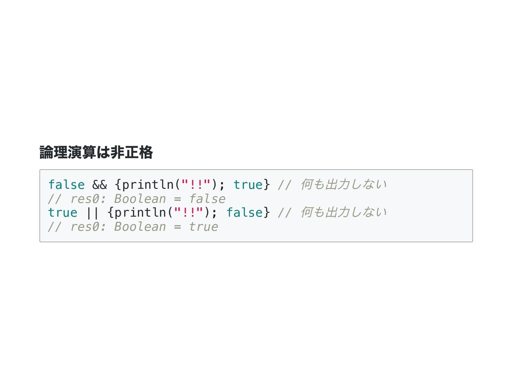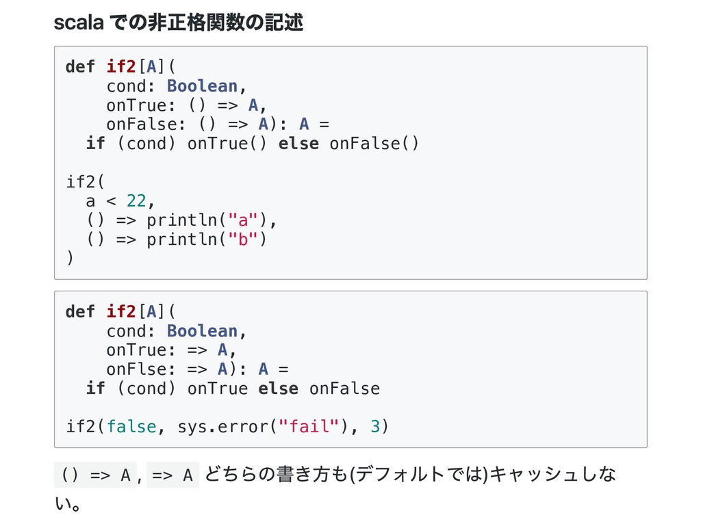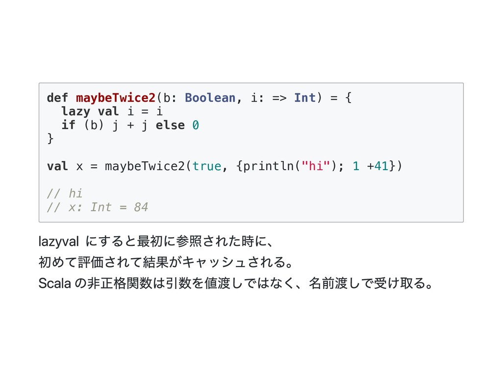 i = i if (b) j + j else 0 } val x = maybeTwice2(true, {println("hi"); 1 +41}) // hi // x: Int = 84 lazy val にすると最初に参照された時に、 初めて評価されて結果がキャッシュされる。 Scala の非正格関数は引数を値渡しではなく、名前渡しで受け取る。