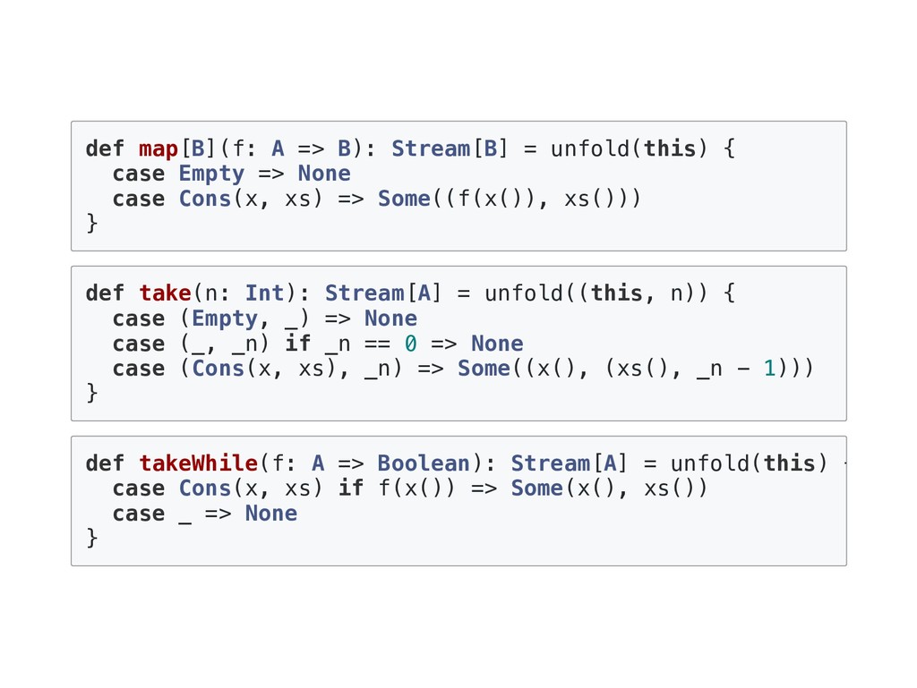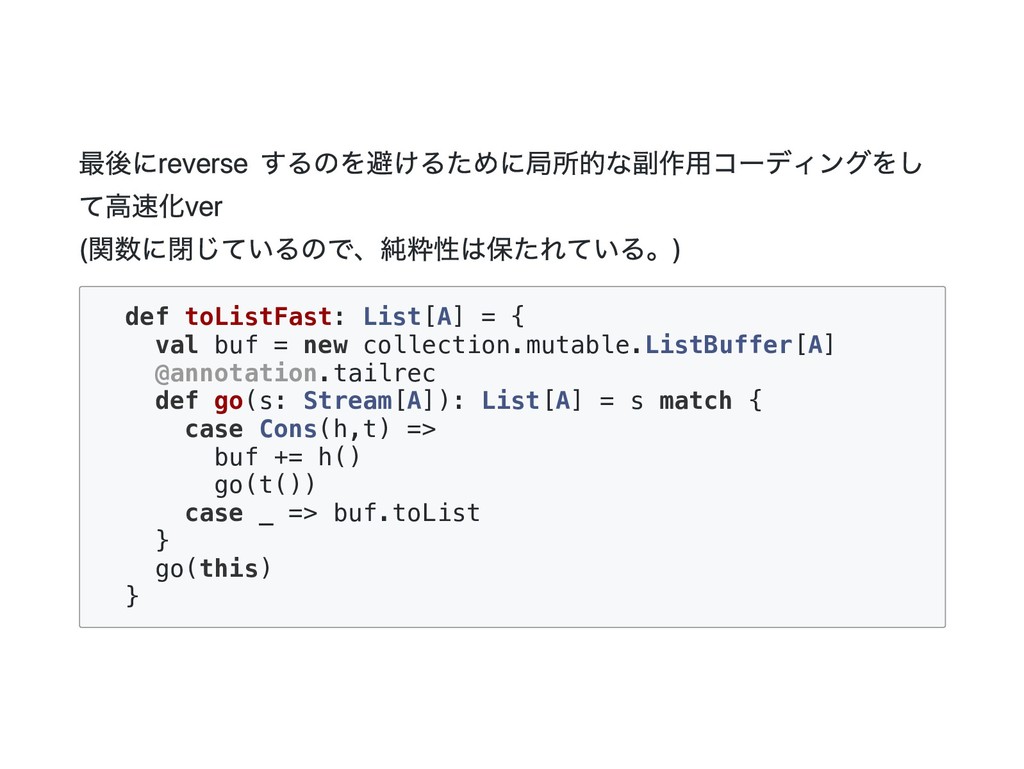{ val buf = new collection.mutable.ListBuffer[A] @annotation.tailrec def go(s: Stream[A]): List[A] = s match { case Cons(h,t) => buf += h() go(t()) case _ => buf.toList } go(this) }
