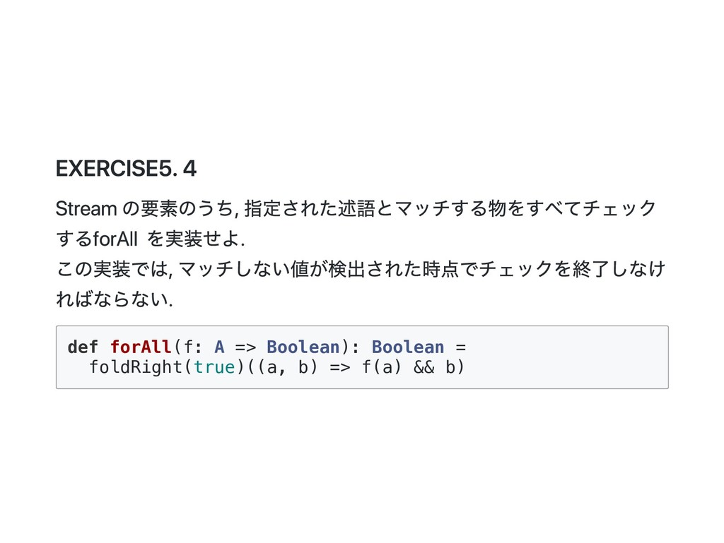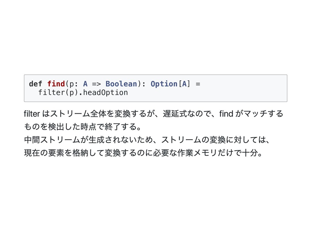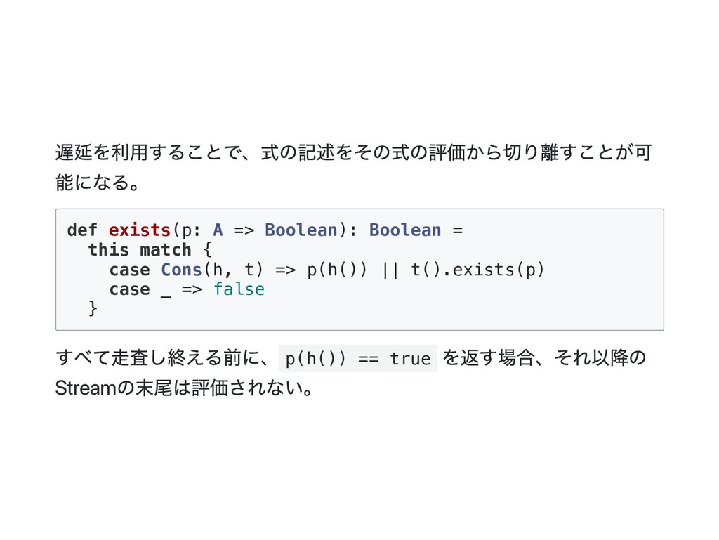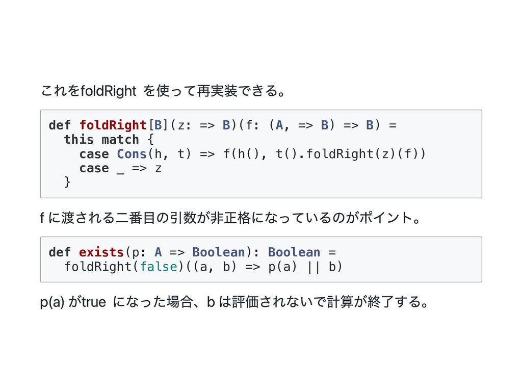 => B) = this match { case Cons(h, t) => f(h(), t().foldRight(z)(f)) case _ => z } f に渡される二番目の引数が非正格になっているのがポイント。 def exists(p: A => Boolean): Boolean = foldRight(false)((a, b) => p(a) || b) p(a) が true になった場合、b は評価されないで計算が終了する。