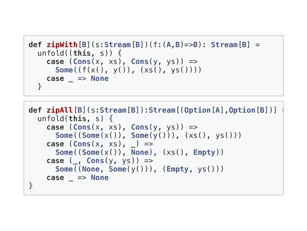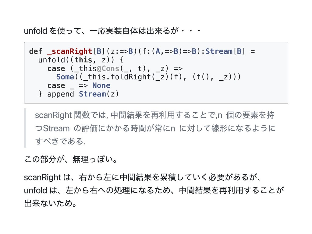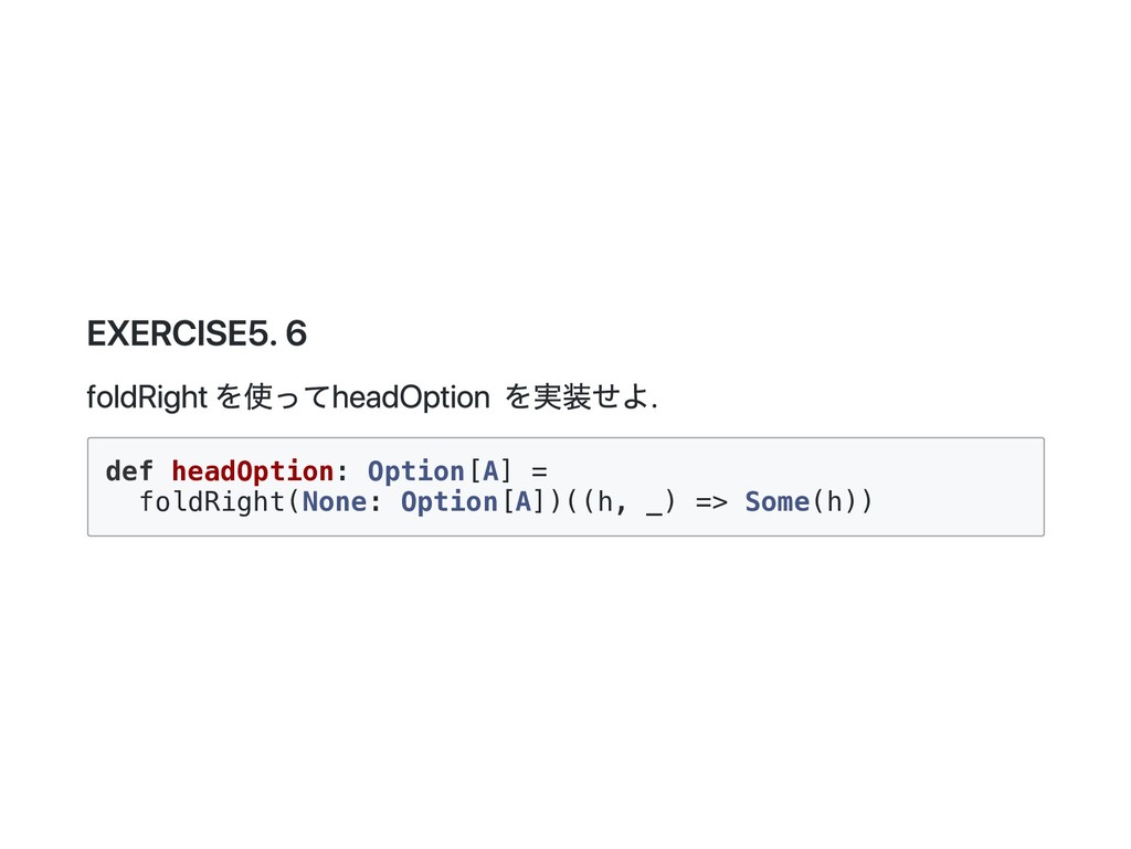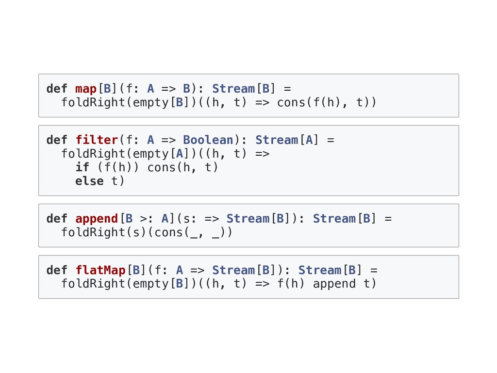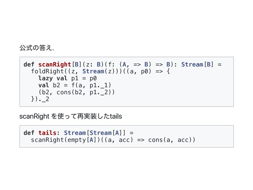 => B) = this match { case Cons(h, t) => f(h(), t().foldRight(z)(f)) case _ => z } f に渡される二番目の引数が非正格になっているのがポイント。 def exists(p: A => Boolean): Boolean = foldRight(false)((a, b) => p(a) || b) p(a) が true になった場合、b は評価されないで計算が終了する。
