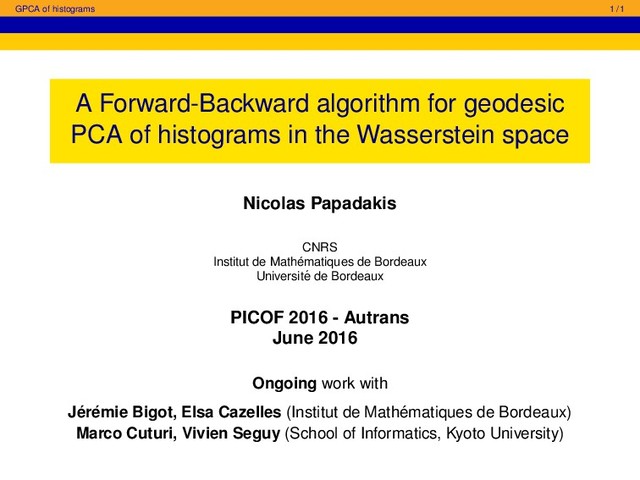 Principal Component Analysis (PCA) in a linear space is certainly the most widely used approach in multivariate statistics to summarize efficiently the information in a data set. In this talk, we are concerned by the statistical analysis of data sets whose elements are histograms with support on the real line. For the purpose of dimension reduction and data visualization of variables in the space of histograms, it is of interest to compute their principal modes of variation around a mean element. However, since the number, size or locations of significant bins may vary from one histogram to another, using PCA in an Euclidean space is not an appropriate tool. In this work, an histogram is modeled as a probability density function (pdf) with support included in an interval of the real line, and the Wasserstein metric is used to measure the distance between two histograms. In this setting, the variability in a set of histograms can be analyzed via the notion of Geodesic PCA (GPCA) of probability measures in the Wasserstein space. However, the implementation of GPCA for data analysis remains a challenging task even in the simplest case of pdf supported on the real line. The main purpose of this talk is thus to present a fast algorithm which performs an exact GPCA of pdf with support on the real line, and to show its usefulness for the statistical analysis of histograms of surnames over years in France.