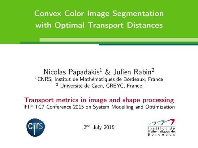 This work concerns the histogram-based segmentation of a color image in two regions. In the considered framework, fixed exemplar histograms define a prior on the statistical features of the two regions in competition. We investigate the use of regularized transport-based cost functions as discrepancy measures between color histograms and consider a spatial regularization of the segmentation map with total variation. We finally rely on a primal-dual algorithm to solve the obtained convex optimization problem. Experiments illustrate the robustness of the proposed method for the segmentation of natural color images.