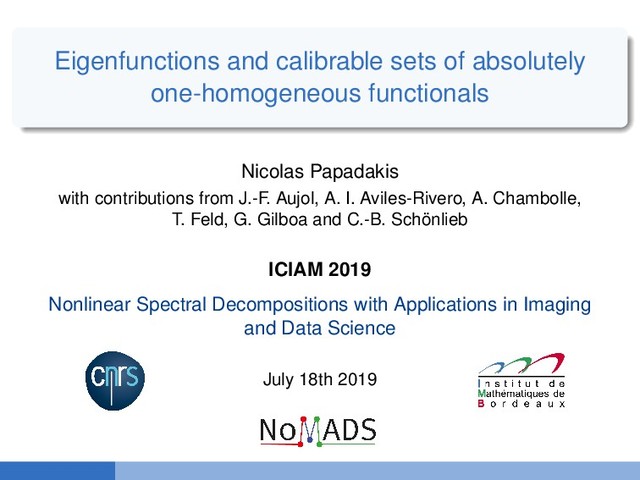 Variation on Ω TV(u) = sup z∈C∞ c ; ||z||∞≤1 Ω udiv(z) Discrete setting in imaging TV(u) = i ||(∇u)i ||2 Denoising with TV: piecewise constant prior • Intensively used for image regularization [Rudin, Osher, Fatemi ‘92] • Theory [Andreu, Ballester, Caselles, Chambolle, Mázon, Novaga... ‘00-] • Algorithms [Chambolle ‘04 and Pock ‘11, Condat ‘13] • Non linear spectral decomposition [Gilboa ‘13-] Lot of (cool) imaging applications [Benning et al. ‘17, Gilboa ‘18] N. Papadakis Eigenfunctions and calibrable sets of absolutely one-homogeneous functionals 1 / 18