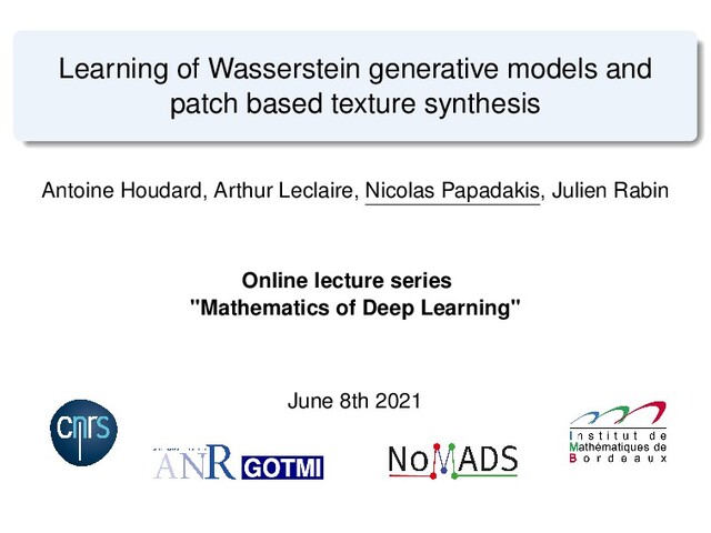 ∈ Rd , and let ν = 1 2 δy1 + 1 2 δy2 with y1, y2 ∈ Rd distinct. Let c(x, y) = x − y p p , p > 1. Then • θ → W(θ) is differentiable everywhere. • For θ0 = y1+y2 2 and any ψ∗ 0 ∈ argmaxψ F(ψ, θ0), θ → F(ψ∗ 0 , θ) is not differentiable at θ0 . Hence (Grad-OT) relation does not hold (except for θ0 = y1+y2 2 ). Proof • F(ψ, θ) = ψc(θ) + 2 j=1 1 2 ψj = mini=1,2 [c(θ, yj ) − ψi ] + ψ1+ψ2 2 Fix θ0 and ψ∗ 0 , then (ψ∗ 0 )1 − (ψ∗ 0 )2 = c(θ0, y1) − c(θ0, y2), and F(ψ∗ 0 , θ) = c(θ, y1) + 1 2 c(θ0, y2) − c(θ0, y1) if θ ∈ L1(ψ∗ 0 ) c(θ, y2) + 1 2 c(θ0, y1) − c(θ0, y2) if θ ∈ L2(ψ∗ 0 ) F(ψ∗ 0 , ·) not differentiable at the boundary between L1(ψ∗ 0 ) and L2(ψ∗ 0 ) N. Papadakis Wasserstein Generative Models for Texture Synthesis 20 / 1