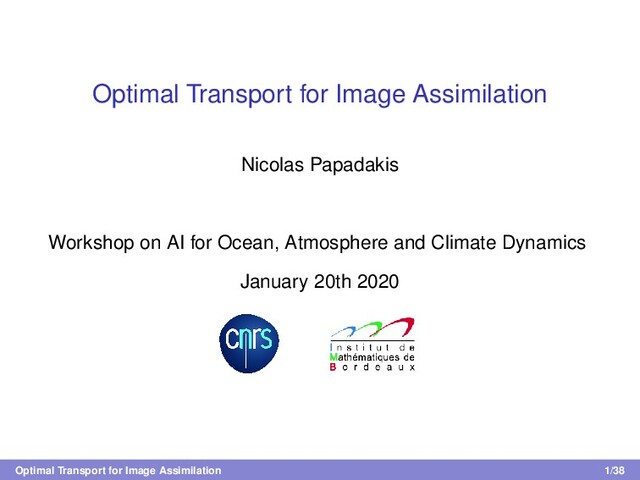 [0, 1] of the geodesic path ρ(x, t): ρ(x, t) = ((1 − t)Id + tT(x)) ρ0 • Non-convex problem over ρ(x, t) ∈ R and velocity field v(x, t) ∈ R2: W2(ρ0, ρ1)2 = min (v,ρ)∈Cv 1 2 [0,1]2 1 0 ρ(x, t)||v(x, t)||2dtdx, under the set of non-linear constraints Cv = (v, ρ) \ ∂t ρ + divx (ρv) = 0, v(0, ·) = v(1, ·) = 0, ρ(·, 0) = ρ0, ρ(·, 1) = ρ1 Change of variable (v, ρ) → (m, ρ), with m = ρv: Convex cost J and linear constraints C No estimation of the transport map T, only the geodesic ρ(x, t) Optimal Transport for Image Assimilation Wasserstein distance 29/38
