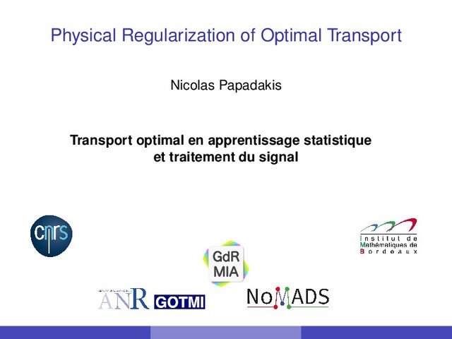 [0, 1] of the geodesic path ρ(x, t): ρ(x, t) = ((1 − t)Id + tT(x)) ρ0 • Non-convex problem over ρ(x, t) ∈ R and velocity field v(x, t) ∈ R2: W2(ρ0, ρ1)2 = min (v,ρ)∈Cv 1 2 [0,1]2 1 0 ρ(x, t)||v(x, t)||2dtdx, under the set of non-linear constraints Cv = (v, ρ) ; ∂t ρ + divx (ρv) = 0, v(0, ·) = v(1, ·) = 0, ρ(·, 0) = ρ0, ρ(·, 1) = ρ1 Change of variable (v, µ) → (m, µ), with m = µv: Convex cost J and linear constraints C No estimation of the transport map T, only the geodesic ρ(x, t) 14 / 50