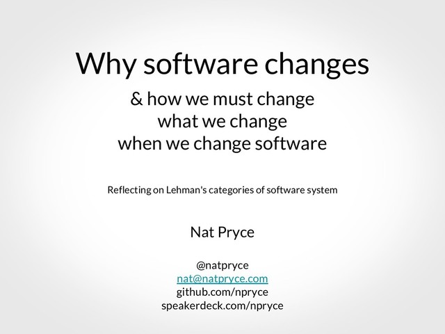 change when we change software Reflecting on Lehman's categories of software system Nat Pryce @natpryce [email protected] github.com/npryce speakerdeck.com/npryce