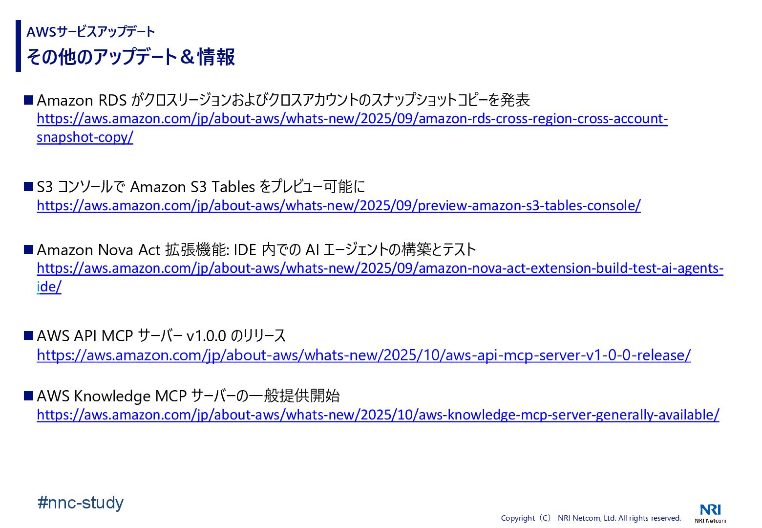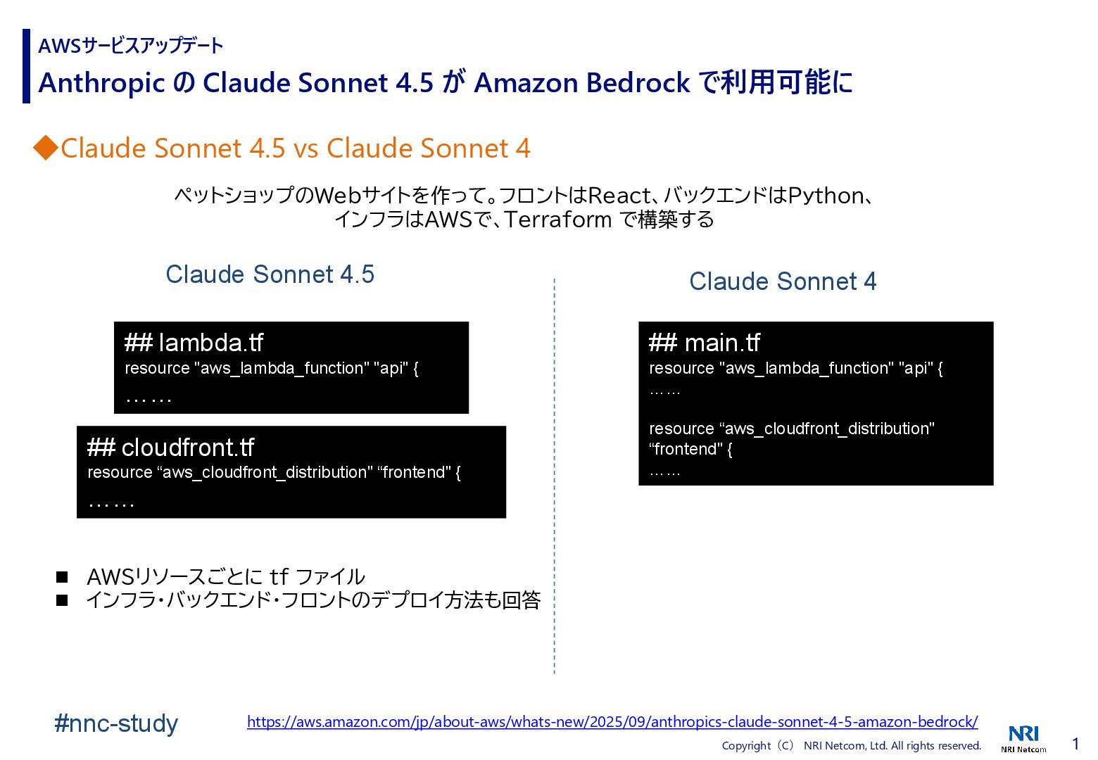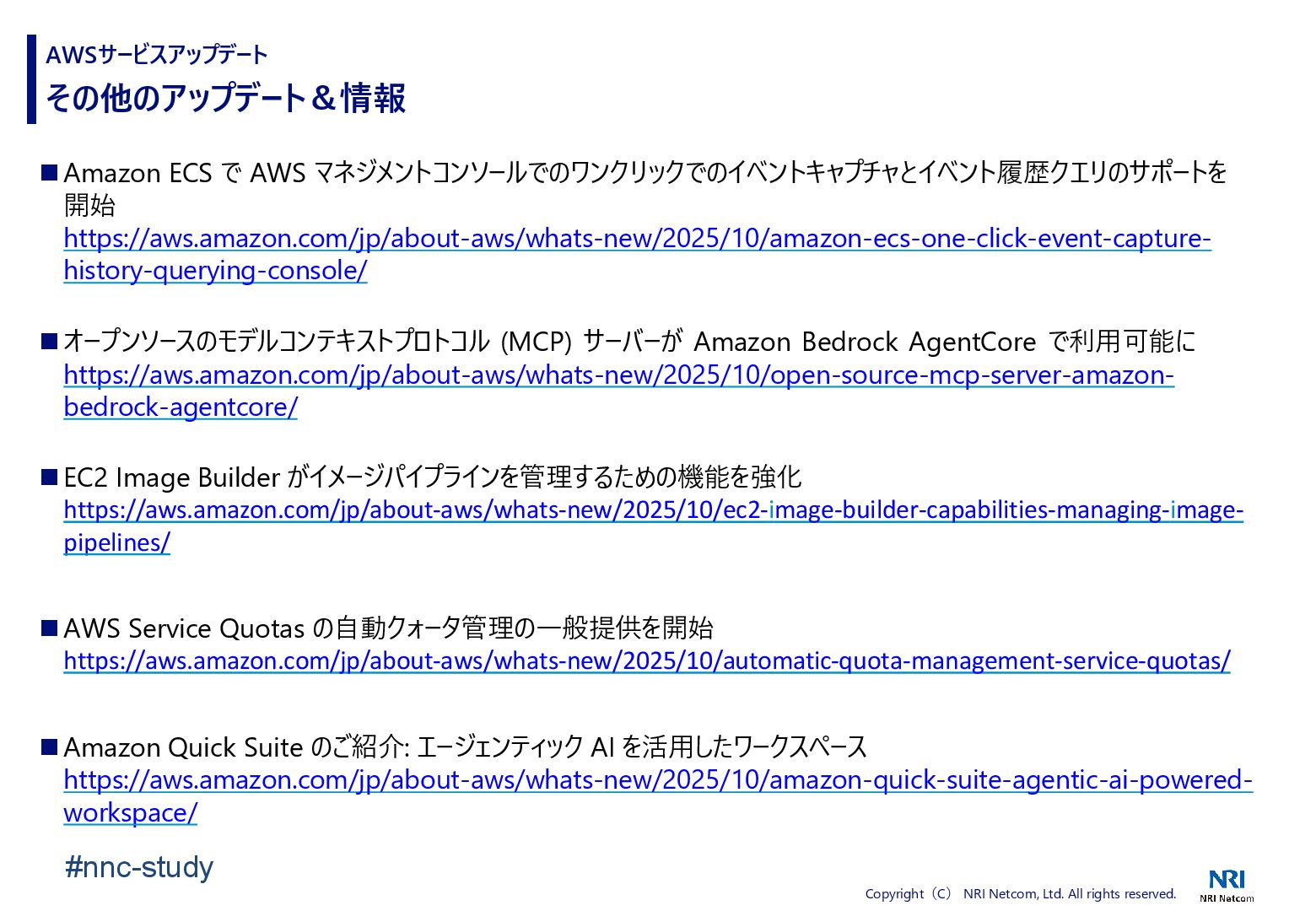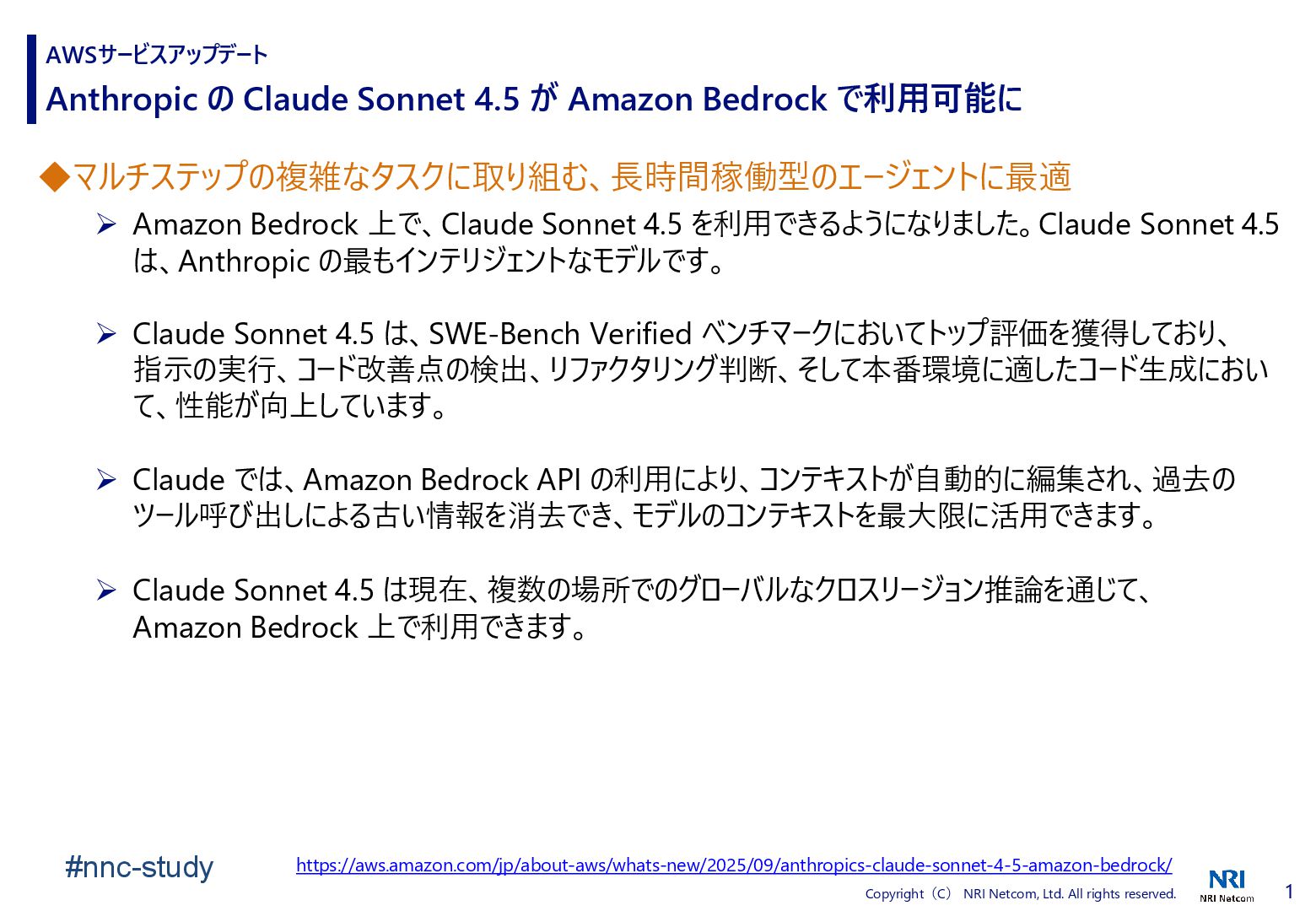 Copyright(C) NRI Netcom, Ltd. All rights reserved. AWSサービスアップデート ◆マルチステップの複雑なタスクに取り組む、長時間稼働型のエージェントに最適 ➢ Amazon Bedrock 上で、Claude Sonnet 4.5 を利用できるようになりました。Claude Sonnet 4.5 は、Anthropic の最もインテリジェントなモデルです。 ➢ Claude Sonnet 4.5 は、SWE-Bench Verified ベンチマークにおいてトップ評価を獲得しており、 指示の実行、コード改善点の検出、リファクタリング判断、そして本番環境に適したコード生成におい て、性能が向上しています。 ➢ Claude では、Amazon Bedrock API の利用により、コンテキストが自動的に編集され、過去の ツール呼び出しによる古い情報を消去でき、モデルのコンテキストを最大限に活用できます。 ➢ Claude Sonnet 4.5 は現在、複数の場所でのグローバルなクロスリージョン推論を通じて、 Amazon Bedrock 上で利用できます。 https://aws.amazon.com/jp/about-aws/whats-new/2025/09/anthropics-claude-sonnet-4-5-amazon-bedrock/ #nnc-study