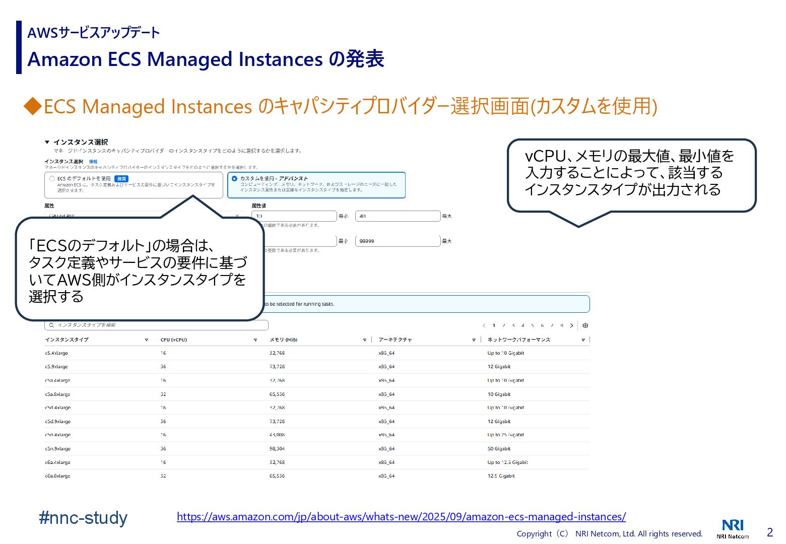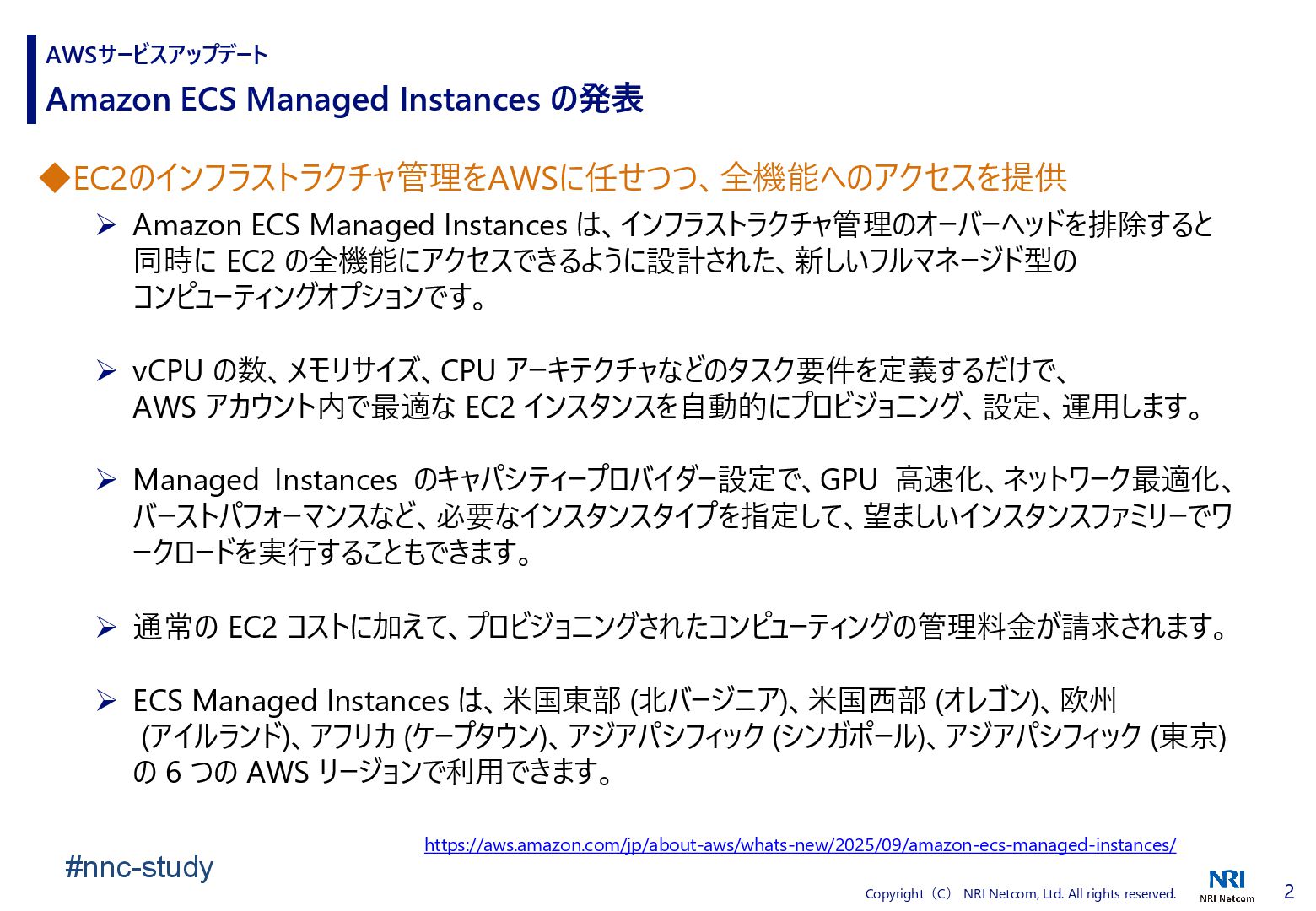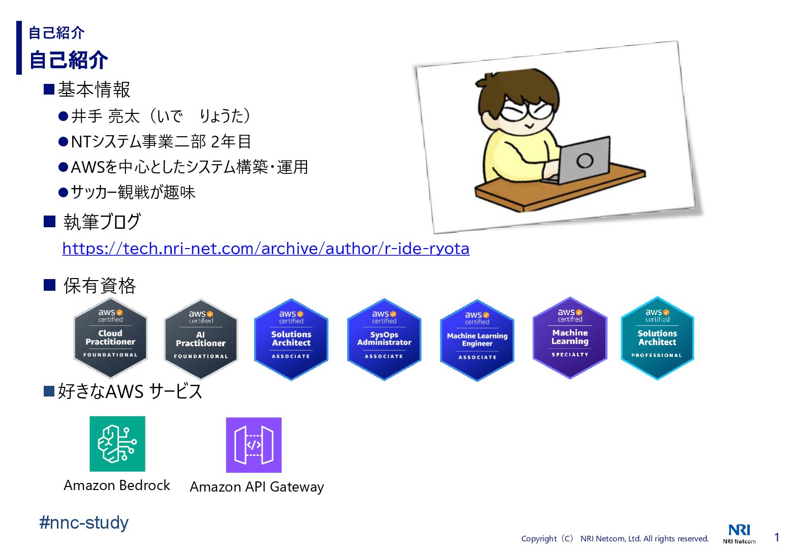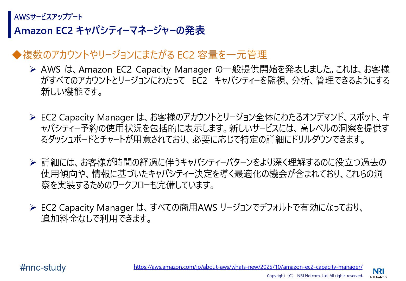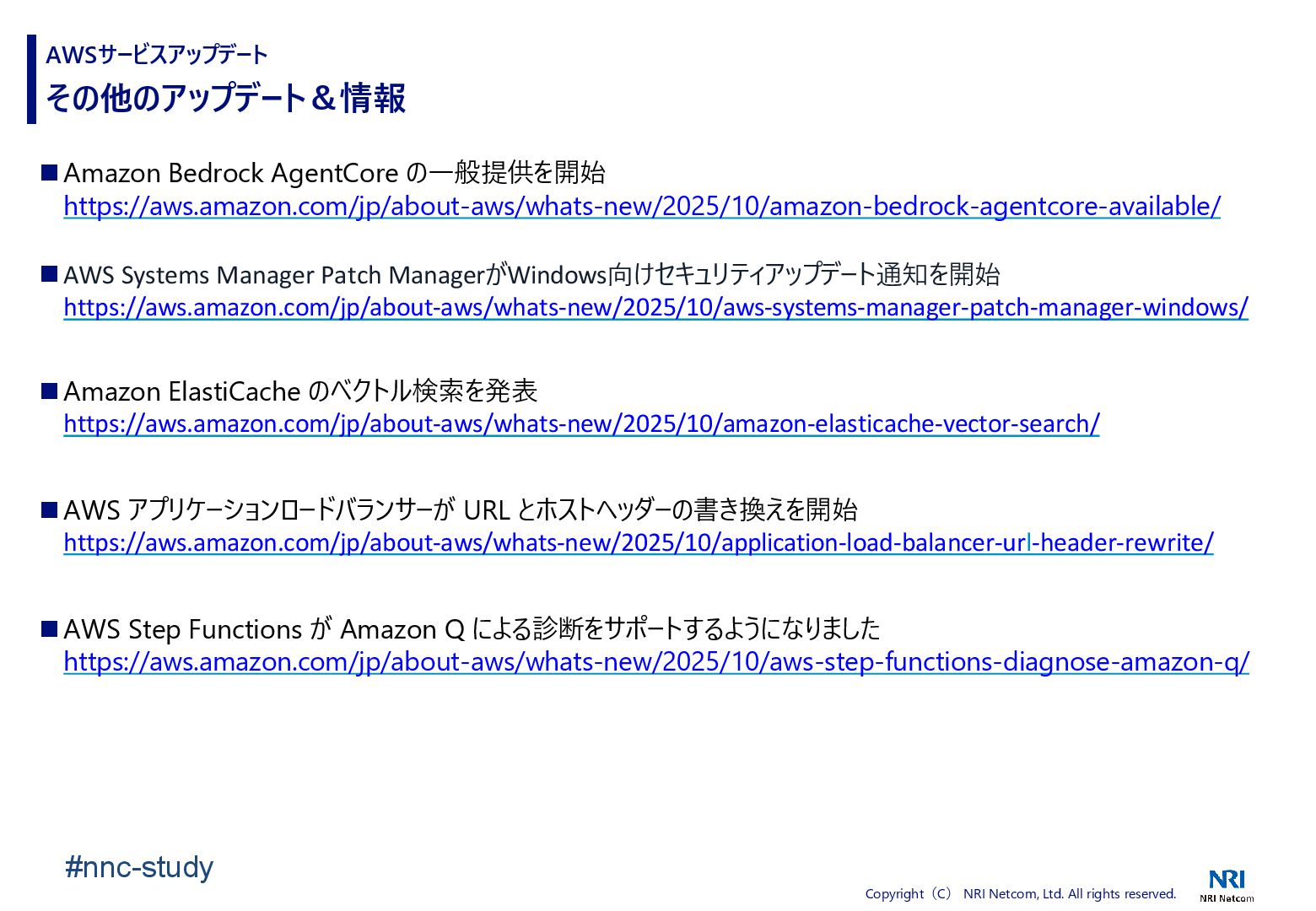 Copyright(C) NRI Netcom, Ltd. All rights reserved. AWSサービスアップデート ◆マルチステップの複雑なタスクに取り組む、長時間稼働型のエージェントに最適 ➢ Amazon Bedrock 上で、Claude Sonnet 4.5 を利用できるようになりました。Claude Sonnet 4.5 は、Anthropic の最もインテリジェントなモデルです。 ➢ Claude Sonnet 4.5 は、SWE-Bench Verified ベンチマークにおいてトップ評価を獲得しており、 指示の実行、コード改善点の検出、リファクタリング判断、そして本番環境に適したコード生成におい て、性能が向上しています。 ➢ Claude では、Amazon Bedrock API の利用により、コンテキストが自動的に編集され、過去の ツール呼び出しによる古い情報を消去でき、モデルのコンテキストを最大限に活用できます。 ➢ Claude Sonnet 4.5 は現在、複数の場所でのグローバルなクロスリージョン推論を通じて、 Amazon Bedrock 上で利用できます。 https://aws.amazon.com/jp/about-aws/whats-new/2025/09/anthropics-claude-sonnet-4-5-amazon-bedrock/ #nnc-study