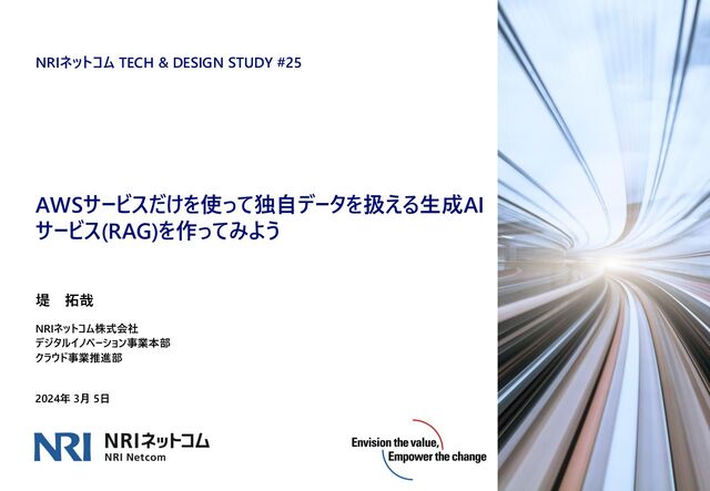 Kendra AWSでの構築方法の紹介 ◼ コスト ・・・△ ⚫ Developer Edition ・・・ $810/月(750 時間の無料利用枠) ⚫ Enterprise Edition ・・・ $1,008/月 ◼ 自由度・・・ 〇 ⚫ Kendraの様々な機能を使える ⚫ セマンティックサーチ ⚫ メタデータ検索 ⚫ ユーザーフィルタリング ⚫ 50種類以上のデータソースに対応 ⚫ 好きなモデルを選択可能 ◼ 実装量・・・ 〇 ⚫ Embeddingの実装をする必要はない ⚫ Bedrockとの接続は実装する必要あり 野村総合研究所ウェブサイト 用語解説より引用 (https://www.nri.com/jp/knowledge/glossary/lst/alphabet/rag) 実装不要 自前で実装 #nncstudy