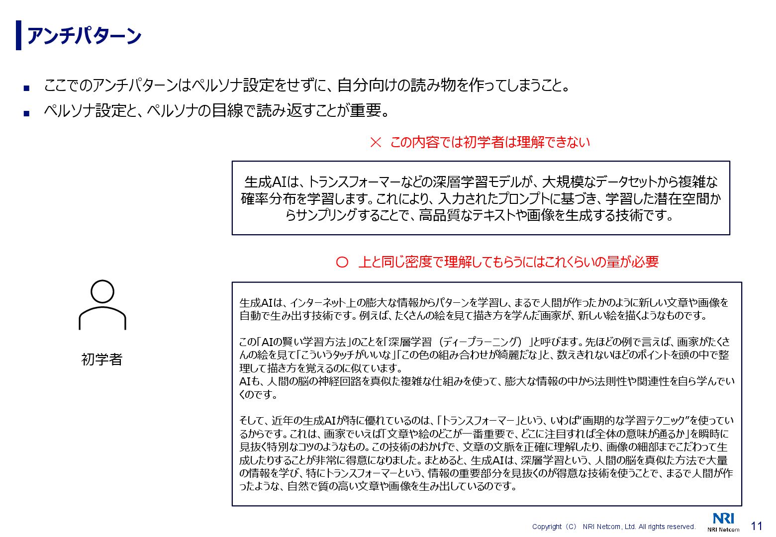 ここでのアンチパターンはペルソナ設定をせずに、自分向けの読み物を作ってしまうこと。 ▪ ペルソナ設定と、ペルソナの目線で読み返すことが重要。 生成AIは、トランスフォーマーなどの深層学習モデルが、大規模なデータセットから複雑な 確率分布を学習します。これにより、入力されたプロンプトに基づき、学習した潜在空間か らサンプリングすることで、高品質なテキストや画像を生成する技術です。 初学者 生成AIは、インターネット上の膨大な情報からパターンを学習し、まるで人間が作ったかのように新しい文章や画像を 自動で生み出す技術です。例えば、たくさんの絵を見て描き方を学んだ画家が、新しい絵を描くようなものです。 この「AIの賢い学習方法」のことを「深層学習(ディープラーニング)」と呼びます。先ほどの例で言えば、画家がたくさ んの絵を見て「こういうタッチがいいな」「この色の組み合わせが綺麗だな」と、数えきれないほどのポイントを頭の中で整 理して描き方を覚えるのに似ています。 AIも、人間の脳の神経回路を真似た複雑な仕組みを使って、膨大な情報の中から法則性や関連性を自ら学んでい くのです。 そして、近年の生成AIが特に優れているのは、「トランスフォーマー」という、いわば“画期的な学習テクニック”を使ってい るからです。これは、画家でいえば「文章や絵のどこが一番重要で、どこに注目すれば全体の意味が通るか」を瞬時に 見抜く特別なコツのようなもの。この技術のおかげで、文章の文脈を正確に理解したり、画像の細部までこだわって生 成したりすることが非常に得意になりました。まとめると、生成AIは、深層学習という、人間の脳を真似た方法で大量 の情報を学び、特にトランスフォーマーという、情報の重要部分を見抜くのが得意な技術を使うことで、まるで人間が作 ったような、自然で質の高い文章や画像を生み出しているのです。 ✕ この内容では初学者は理解できない 〇 上と同じ密度で理解してもらうにはこれくらいの量が必要