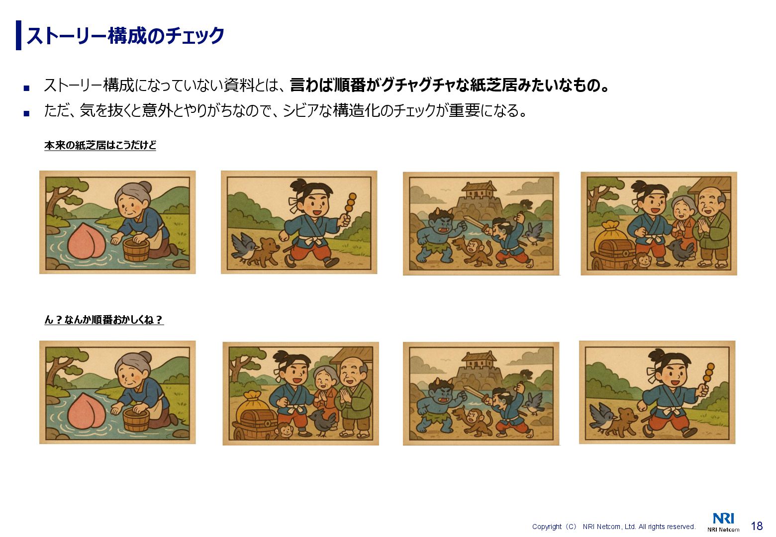 ストーリー構成になっていない資料とは、言わば順番がグチャグチャな紙芝居みたいなもの。 ▪ ただ、気を抜くと意外とやりがちなので、シビアな構造化のチェックが重要になる。 本来の紙芝居はこうだけど ん?なんか順番おかしくね?