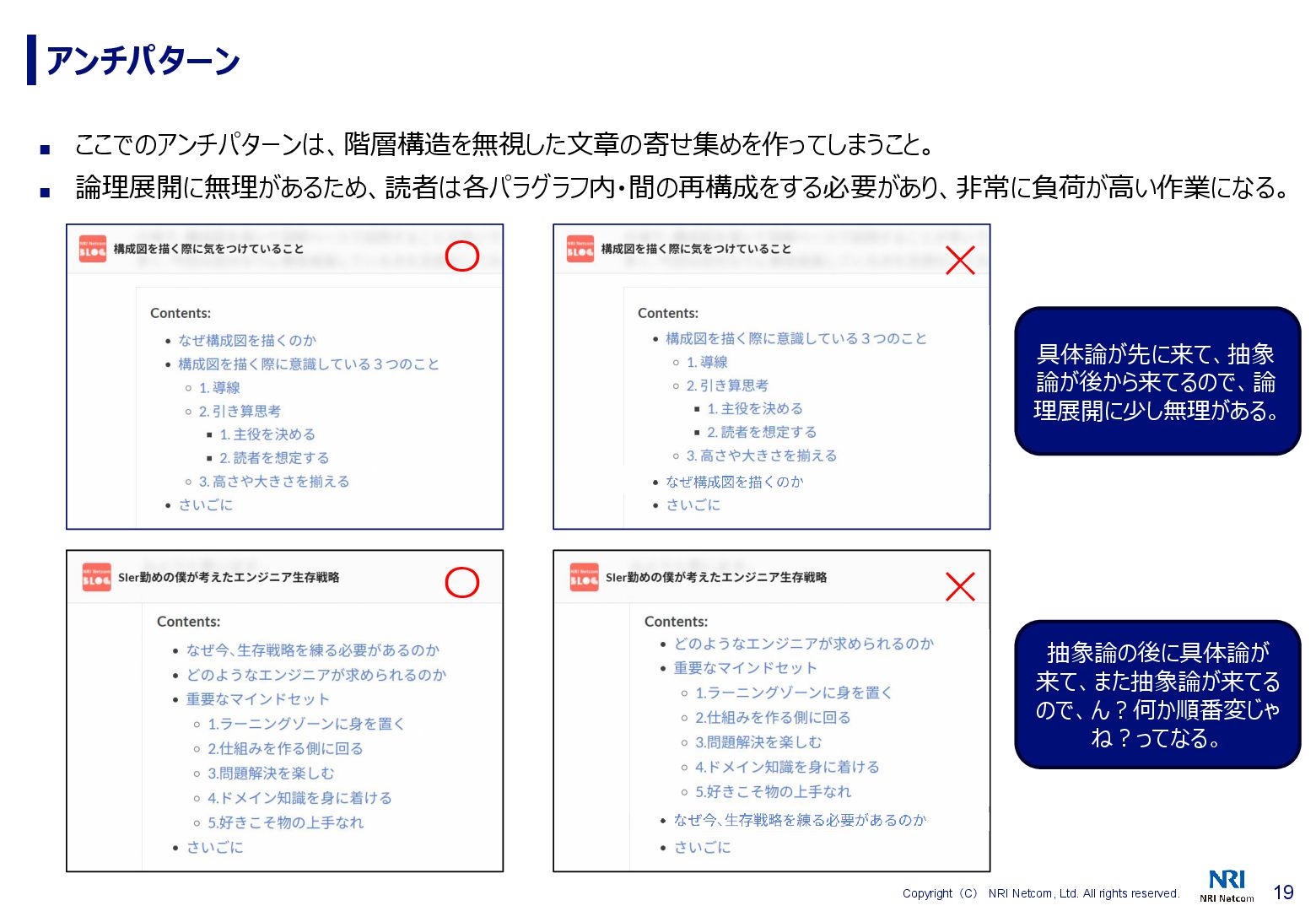 ここでのアンチパターンは、階層構造を無視した文章の寄せ集めを作ってしまうこと。 ▪ 論理展開に無理があるため、読者は各パラグラフ内・間の再構成をする必要があり、非常に負荷が高い作業になる。 〇 ✕ 〇 ✕ 具体論が先に来て、抽象 論が後から来てるので、論 理展開に少し無理がある。 抽象論の後に具体論が 来て、また抽象論が来てる ので、ん?何か順番変じゃ ね?ってなる。