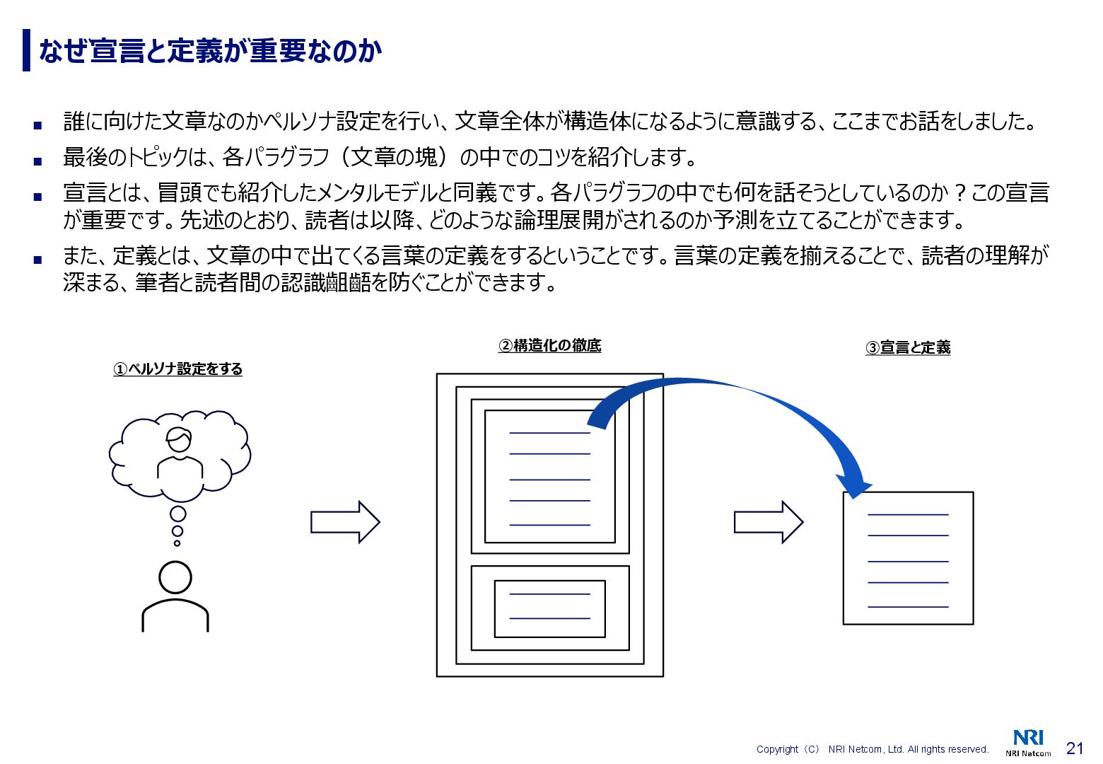 誰に向けた文章なのかペルソナ設定を行い、文章全体が構造体になるように意識する、ここまでお話をしました。 ▪ 最後のトピックは、各パラグラフ(文章の塊)の中でのコツを紹介します。 ▪ 宣言とは、冒頭でも紹介したメンタルモデルと同義です。各パラグラフの中でも何を話そうとしているのか?この宣言 が重要です。先述のとおり、読者は以降、どのような論理展開がされるのか予測を立てることができます。 ▪ また、定義とは、文章の中で出てくる言葉の定義をするということです。言葉の定義を揃えることで、読者の理解が 深まる、筆者と読者間の認識齟齬を防ぐことができます。 ➀ペルソナ設定をする ➁構造化の徹底 ➂宣言と定義