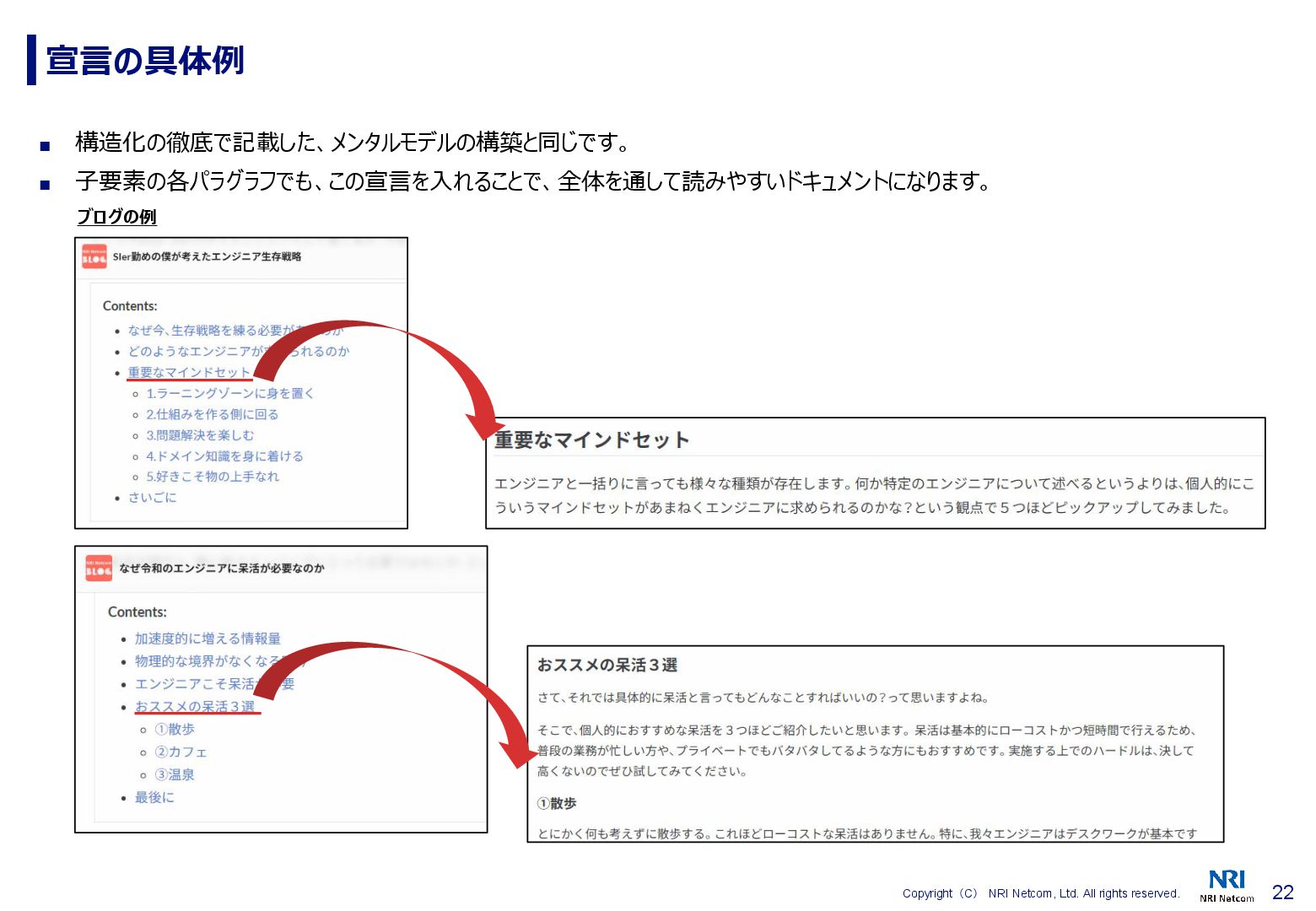 構造化の徹底で記載した、メンタルモデルの構築と同じです。 ▪ 子要素の各パラグラフでも、この宣言を入れることで、全体を通して読みやすいドキュメントになります。 ブログの例