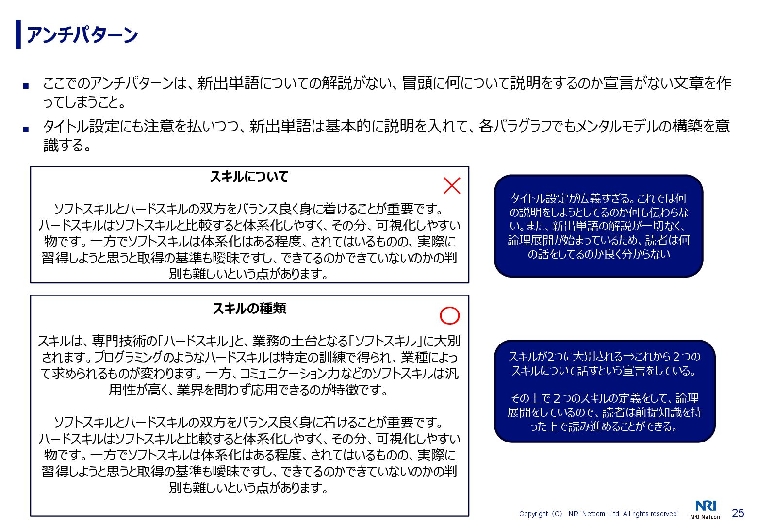 されます。プログラミングのようなハードスキルは特定の訓練で得られ、業種によっ て求められるものが変わります。一方、コミュニケーション力などのソフトスキルは汎 用性が高く、業界を問わず応用できるのが特徴です。 ソフトスキルとハードスキルの双方をバランス良く身に着けることが重要です。 ハードスキルはソフトスキルと比較すると体系化しやすく、その分、可視化しやすい 物です。一方でソフトスキルは体系化はある程度、されてはいるものの、実際に 習得しようと思うと取得の基準も曖昧ですし、できてるのかできていないのかの判 別も難しいという点があります。 アンチパターン ▪ ここでのアンチパターンは、新出単語についての解説がない、冒頭に何について説明をするのか宣言がない文章を作 ってしまうこと。 ▪ タイトル設定にも注意を払いつつ、新出単語は基本的に説明を入れて、各パラグラフでもメンタルモデルの構築を意 識する。 スキルについて ソフトスキルとハードスキルの双方をバランス良く身に着けることが重要です。 ハードスキルはソフトスキルと比較すると体系化しやすく、その分、可視化しやすい 物です。一方でソフトスキルは体系化はある程度、されてはいるものの、実際に 習得しようと思うと取得の基準も曖昧ですし、できてるのかできていないのかの判 別も難しいという点があります。 〇 ✕ タイトル設定が広義すぎる。これでは何 の説明をしようとしてるのか何も伝わらな い。また、新出単語の解説が一切なく、 論理展開が始まっているため、読者は何 の話をしてるのか良く分からない スキルが2つに大別される⇒これから2つの スキルについて話すという宣言をしている。 その上で2つのスキルの定義をして、論理 展開をしているので、読者は前提知識を持 った上で読み進めることができる。