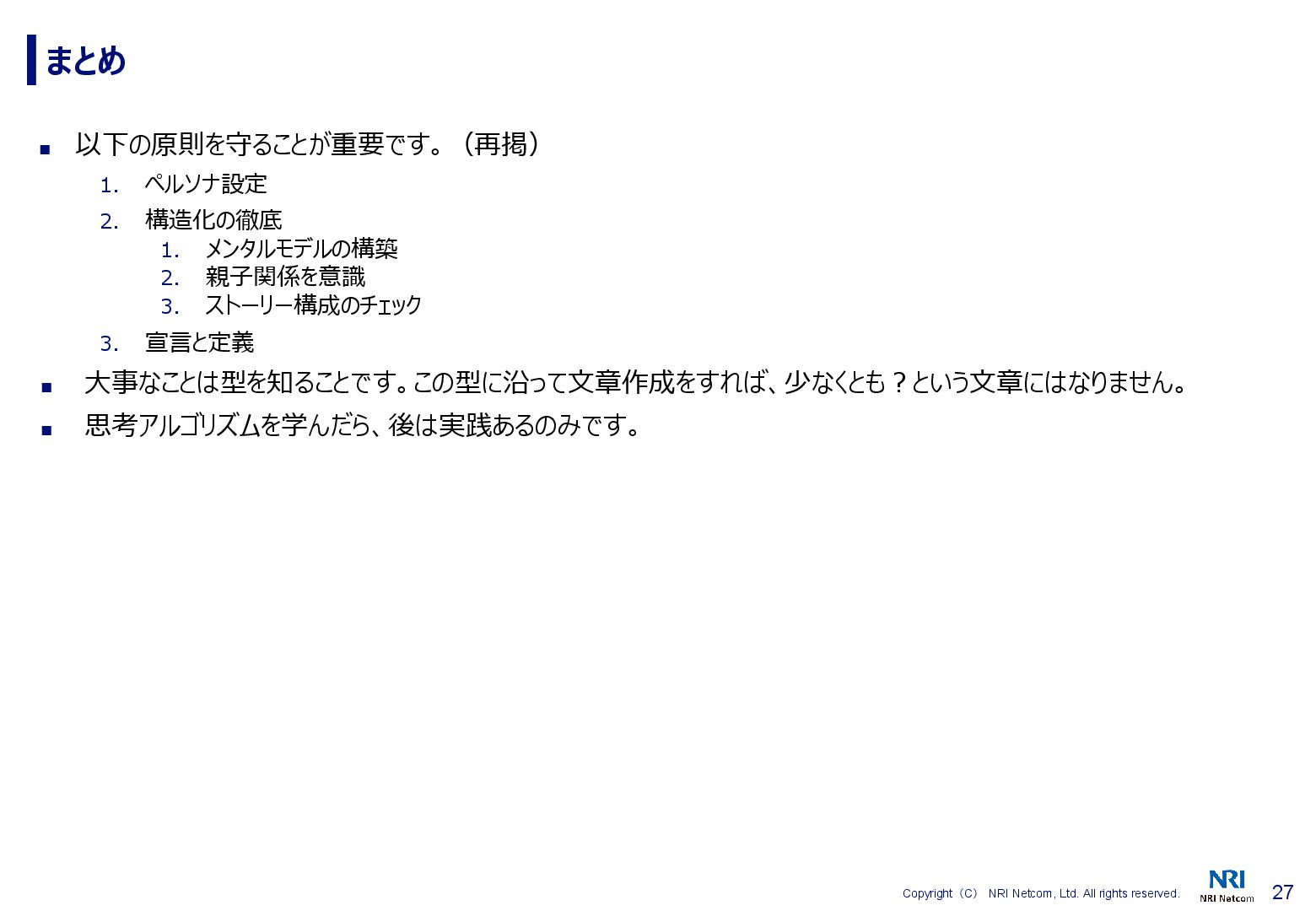 以下の原則を守ることが重要です。(再掲) 1. ペルソナ設定 2. 構造化の徹底 1. メンタルモデルの構築 2. 親子関係を意識 3. ストーリー構成のチェック 3. 宣言と定義 ▪ 大事なことは型を知ることです。この型に沿って文章作成をすれば、少なくとも?という文章にはなりません。 ▪ 思考アルゴリズムを学んだら、後は実践あるのみです。