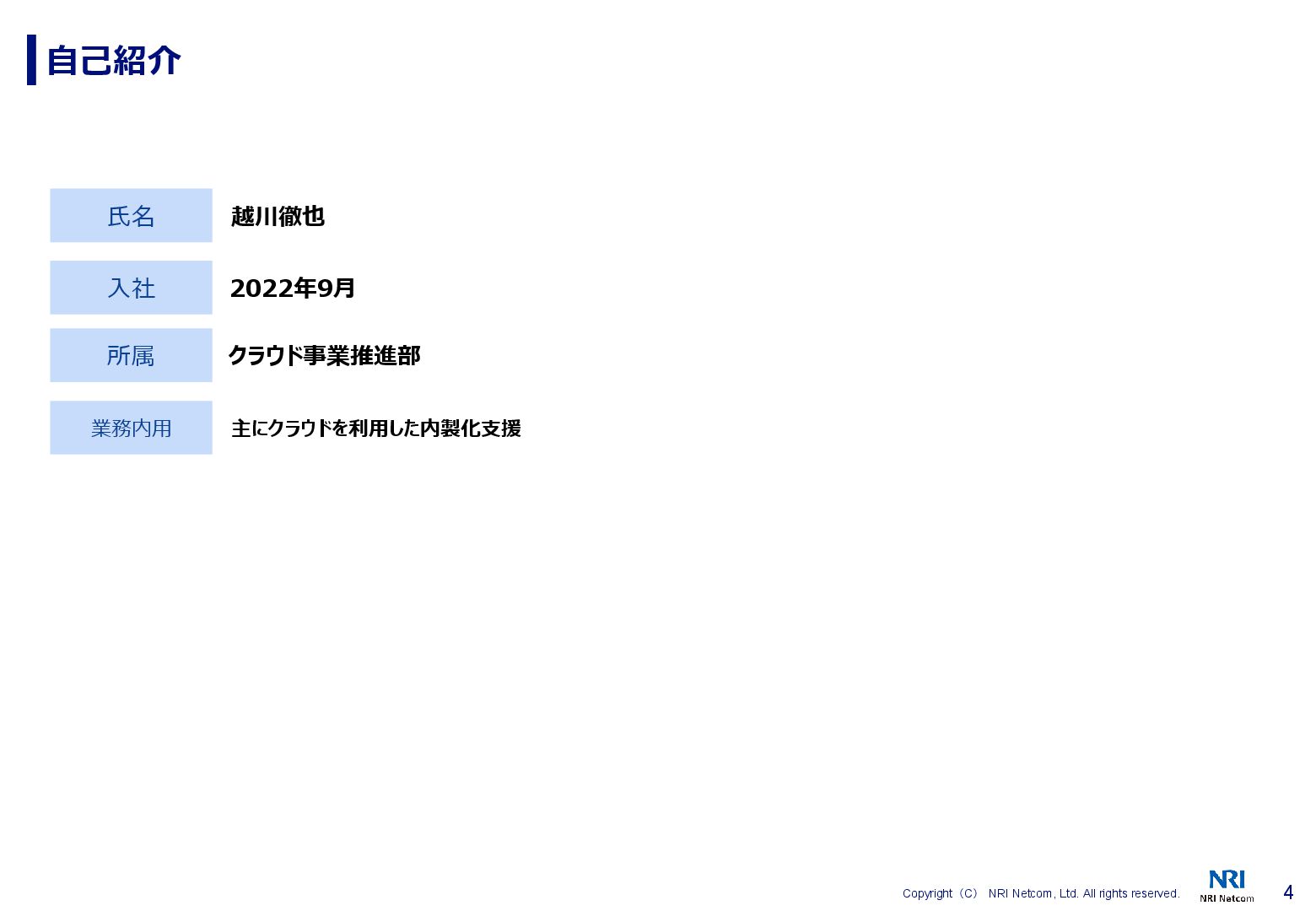 所属 業務内用 2022年9月 クラウド事業推進部 主にクラウドを利用した内製化支援 氏名 越川徹也