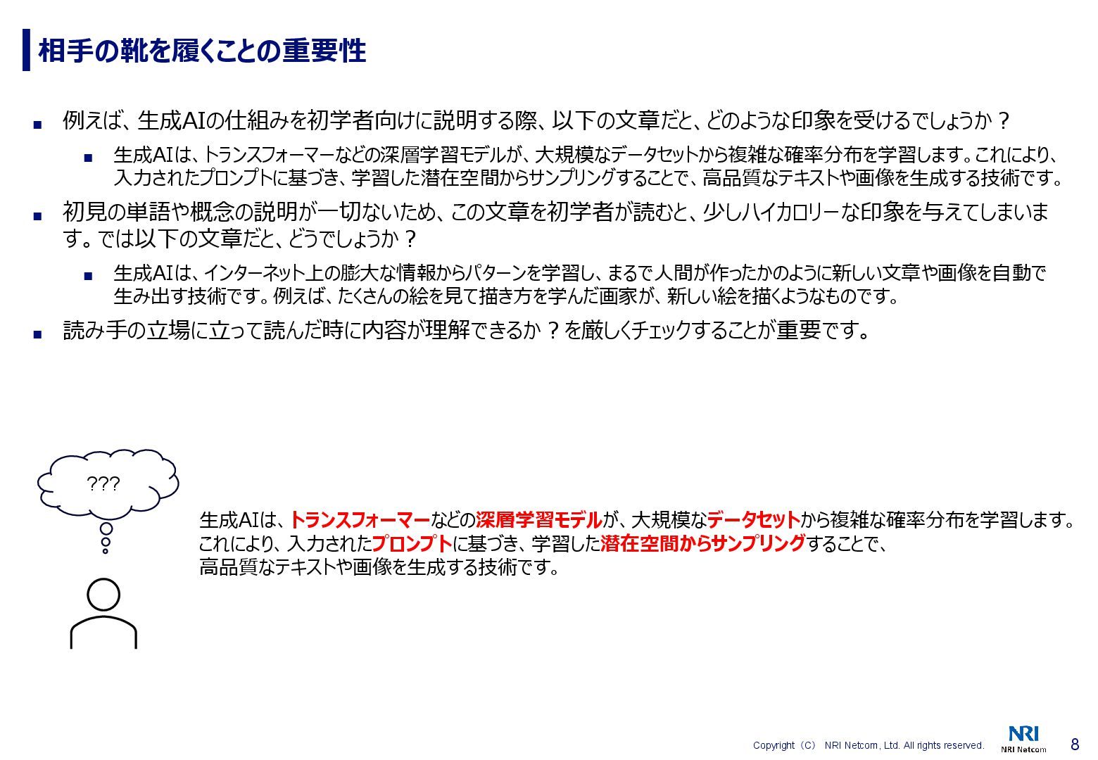 例えば、生成AIの仕組みを初学者向けに説明する際、以下の文章だと、どのような印象を受けるでしょうか? ▪ 生成AIは、トランスフォーマーなどの深層学習モデルが、大規模なデータセットから複雑な確率分布を学習します。これにより、 入力されたプロンプトに基づき、学習した潜在空間からサンプリングすることで、高品質なテキストや画像を生成する技術です。 ▪ 初見の単語や概念の説明が一切ないため、この文章を初学者が読むと、少しハイカロリーな印象を与えてしまいま す。では以下の文章だと、どうでしょうか? ▪ 生成AIは、インターネット上の膨大な情報からパターンを学習し、まるで人間が作ったかのように新しい文章や画像を自動で 生み出す技術です。例えば、たくさんの絵を見て描き方を学んだ画家が、新しい絵を描くようなものです。 ▪ 読み手の立場に立って読んだ時に内容が理解できるか?を厳しくチェックすることが重要です。 ??? 生成AIは、トランスフォーマーなどの深層学習モデルが、大規模なデータセットから複雑な確率分布を学習します。 これにより、入力されたプロンプトに基づき、学習した潜在空間からサンプリングすることで、 高品質なテキストや画像を生成する技術です。