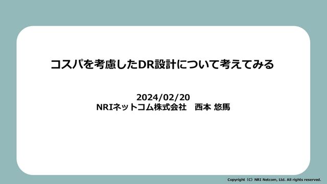 Ltd. All rights reserved. 26 26 〇パイロットライトの方式をとったとしてもコストを最小限にしたい… ▷RPO,RTOを再度確認する ・冒頭で触れたRPO, RTOを確認して、復旧時間や復旧目標時点を確認する ▷コストが高くなっているリソースを中心にコスト削減できないか検討 ・今回はシンプルな構成例を挙げていますが、Aurora, NATGateway, DynamoDBの料金がそれなりに高く なるような構成になっている。ここの削減について、次のページで紹介する。 本題 – Main Topic -