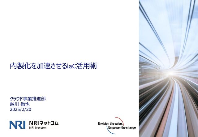 IaCを活用することのメリットは以下のとおり。 ◼ 時間短縮 ⚫ 一度コードを作成してしまえば、あとはデプロイするだけなので、マネジメントコンソールから作成するより非常に短い時間 で構築することが可能 ◼ 透明性 ⚫ 設計書と実態のリソースが一致しないケースは良くある。IaCで書いてしまえば、そのコードを見れば各リソースのスペック 等が実体と基本的には一致しているため、コード自体を確認すればリソースの実体が把握可能 ◼ 一貫性 ⚫ GitHubなどでバージョン管理をすればコードの履歴を管理することもできる。そのため、何か問題が生じた際のトレーサビ リティも担保される ◼ 冪等性 ⚫ 人の手でマネジメントコンソールから0ベースで構築するのはヒューマンエラーの原因となる。STGやPRODなど別環境で リソースを作成する際も手動の場合はミスの原因となる。IaCの場合、同じコマンドを実行すれば、同じ結果になるため ヒューマンエラーの防止策となる。 ◼ 登壇者(越川)はAWS CDKを使った内製化のご支援をしている。
