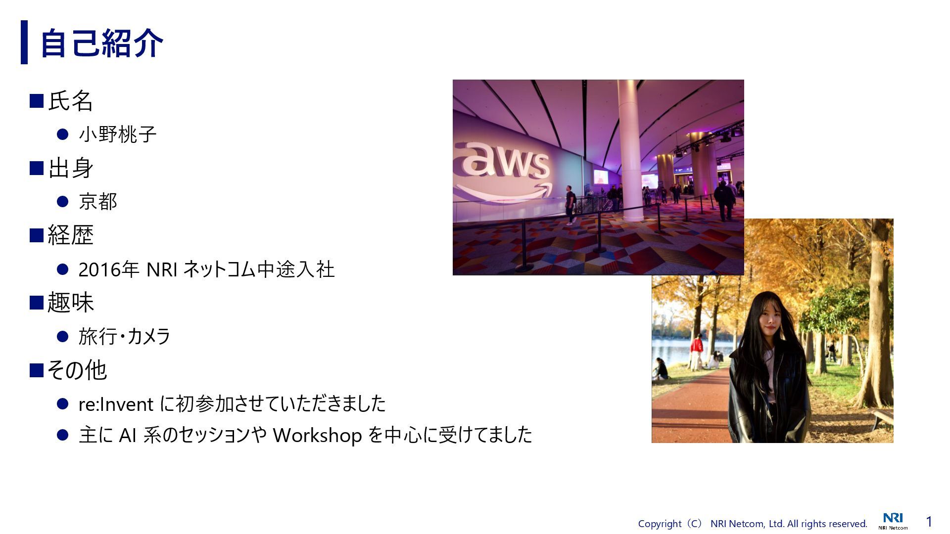小野桃子 ◼出身 ⚫ 京都 ◼経歴 ⚫ 2016年 NRI ネットコム中途入社 ◼趣味 ⚫ 旅行・カメラ ◼その他 ⚫ re:Invent に初参加させていただきました ⚫ 主に AI 系のセッションや Workshop を中心に受けてました 自己紹介