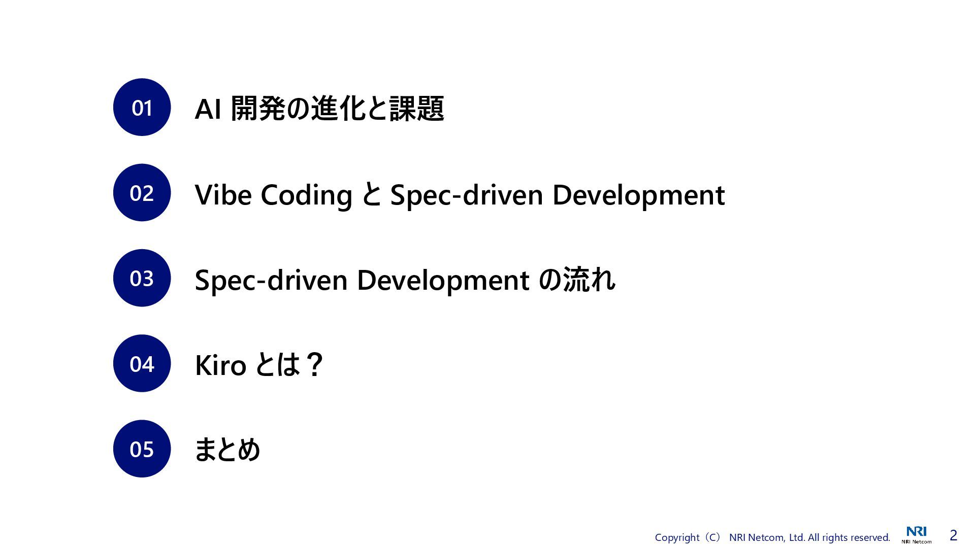 01 Vibe Coding と Spec-driven Development 02 Spec-driven Development の流れ 03 Kiro とは? 04 まとめ 05